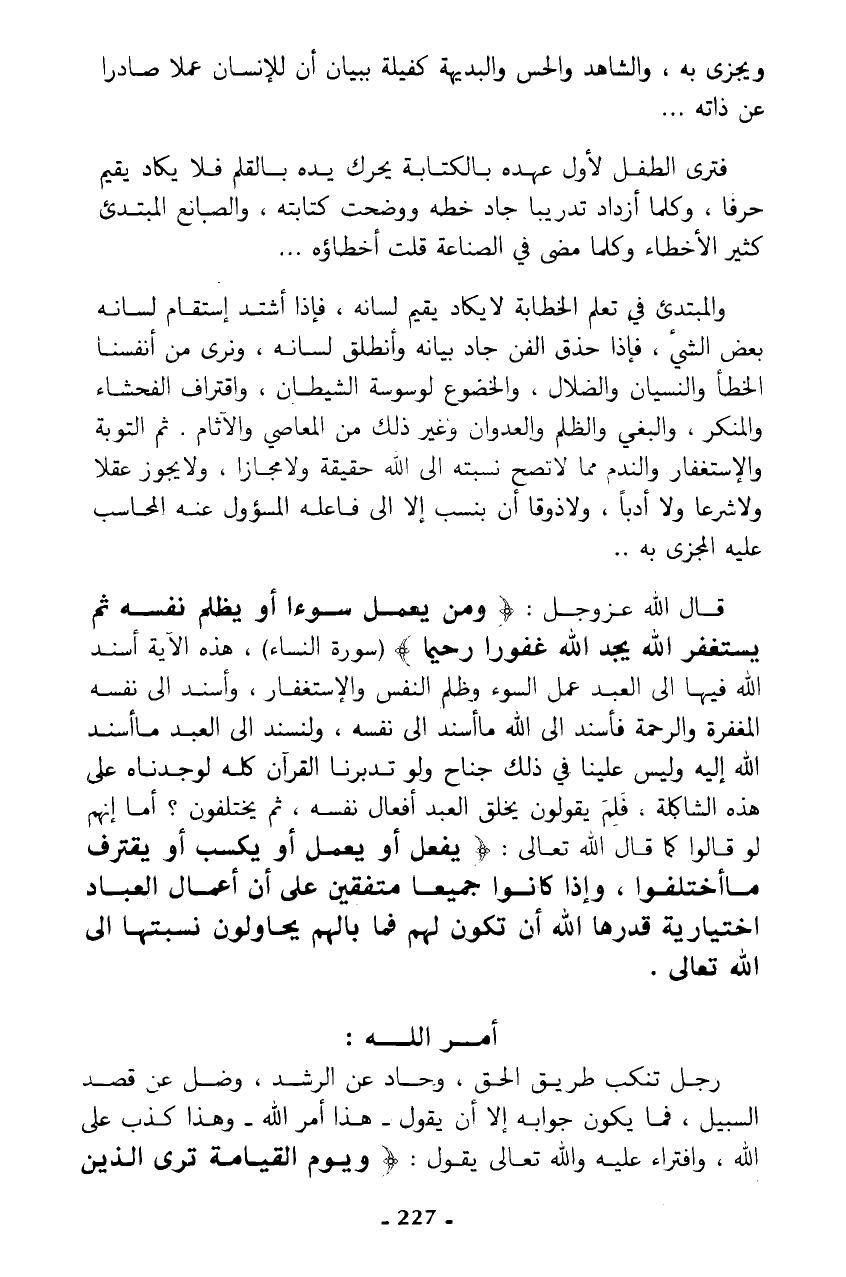 والمبتدئ في تعلم الخطابة لا يكاد يقيم لسانه، فإذا أشتد إستقام لسانه بعض الشيء، فإذا حذق الفن جاد بيانه وأنطلق لسانه، ونرى من أنفسنا الخطأ والنسيان والضلال، والخضوع لوسوسة الشيطان، واقتراف الفحشاء والمنكر، والبغي والظلم والعدوان وغير ذلك من المعاصي والآثام. ثم التوبة والإستغفار والندم مما لا تصح نسبته الى الله حقيقة ولا مجازا، ولا يجوز عقلا ولا شرعا ولا أدبا، ولا ذوقا أن بنسب إلا الى فاعله المسؤول عنه المحاسب عليه المجزي به ..