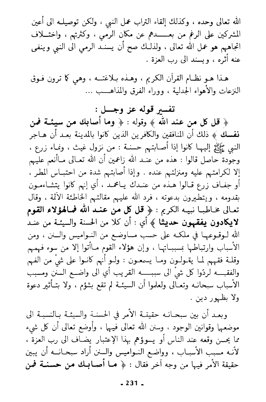 {قُلْ كُلٌّ مِنْ عِنْدِ اللَّهِ} وقوله: {وَمَا أَصَابَكَ مِنْ سَيِّئَةٍ فَمِنْ نَفْسِكَ} ذلك أن المنافقين والكافرين الذين كانوا بالمدينة بعد أن هاجر النبي - صلى الله عليه وسلم - إليها كانوا إذا أصابتهم حسنة: من نزول غيث، ونماء زرع، وجودة حاصل قالوا: هذه من عند الله زاعين أن الله تعالى ما أنعم عليهم إلا لكرامتهم عليه ومنزلتهم عنده. وإذا أصابتهم شدة من احتباس المطر، أو جفاف زرع قالوا هذه من عندك يا محمد، أي إنهم كانوا يتشاءمون بقدومه، ويتطيرون بدعوته، فرد الله عليهم مقالتهم الخاطئة الآثمة، وقال تعالى مخاطبا نبيه الكريم: {قُلْ كُلٌّ مِنْ عِنْدِ اللَّهِ فَمَالِ هَؤُلَاءِ الْقَوْمِ لَا يَكَادُونَ يَفْقَهُونَ حَدِيثًا} أي: أن كلا من الحسنة والسيئة من عند الله لوقوعها في ملكه على حسب ما وضع من النواميس والسنن، ومن الأسباب وارتباطها بمسبباتها، وإن هؤلاء القوم ما أتوا إلا من سوء فهمهم وقلة فقههم لما يقولون وما يسمعون: ولو أنهم كانوا على شيء من الفهم والفقه لردوا كل شيء الى سببه القريب أي الى واضع السنن ومسبب الأسباب سبحانه وتعالى ولعلموا أن السيئة لم تقع بشؤم، ولا بتأثير دعوة ولا بظهور دين.