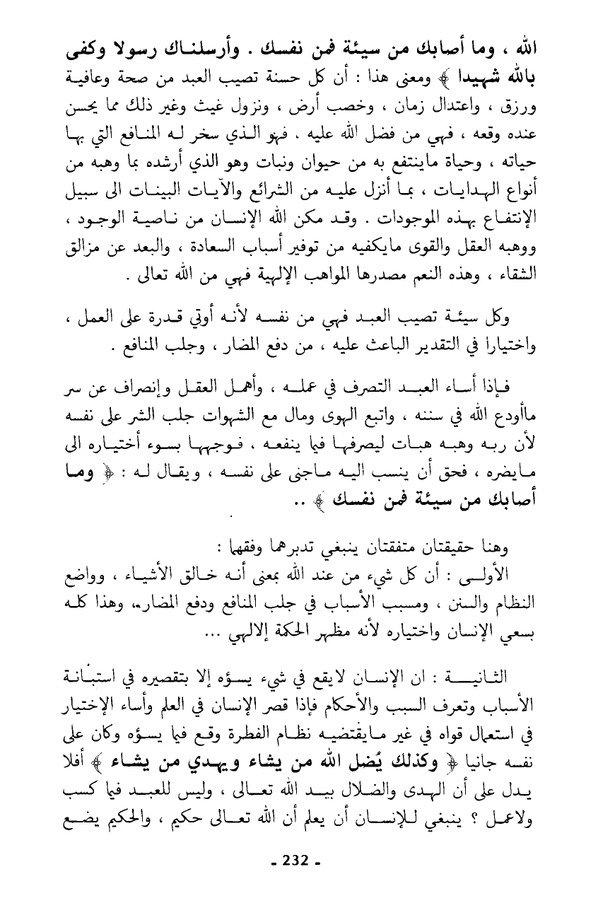 اللَّهِ وَمَا أَصَابَكَ مِنْ سَيِّئَةٍ فَمِنْ نَفْسِكَ وَأَرْسَلْنَاكَ لِلنَّاسِ رَسُولًا وَكَفَى بِاللَّهِ شَهِيدًا} ومعنى هذا: أن كل حسنة تصيب العبد من صحة وعافية ورزق، واعتدال زمان، وخصب أرض، ونزول غيث وغير ذلك مما يحسن عنده وقعه، فهي من فضل الله عليه، فهو الذي سخر له المنافع التي بها حياته، وحياة ما ينتفع به من حيوان ونبات وهو الذي أرشده بما وهبه من أنواع الهدايات، بما أنزل عليه من الشرائع والآيات البينات الى سبيل الإنتفاع بهذه الموجودات. وقد مكن الله الإنسان من ناصية الوجود، ووهبه العقل والقوى ما يكفيه من توفير أسباب السعادة، والبعد عن مزالق الشقاء، وهذه النعم مصدرها المواهب الإلهية فهي من الله تعالى.