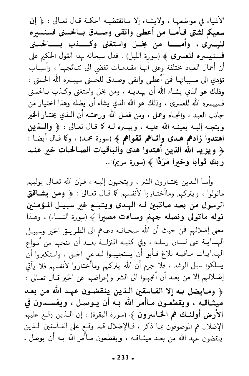 الأشياء في مواضعها، ولا يشاء إلا ما تقتضيه الحكمة قال تعالى: {إِنَّ سَعْيَكُمْ لَشَتَّى * فَأَمَّا مَنْ أَعْطَى وَاتَّقَى * وَصَدَّقَ بِالْحُسْنَى * فَسَنُيَسِّرُهُ لِلْيُسْرَى * وَأَمَّا مَنْ بَخِلَ وَاسْتَغْنَى * وَكَذَّبَ بِالْحُسْنَى * فَسَنُيَسِّرُهُ لِلْعُسْرَى} (سورة الليل). فدل سبحانه بهذا القول الحكيم على أن أعمال العباد مختلفة وعلى أنها مقدمات تفضي الى نتائجها، وأسباب تؤدي الى مسبباتها فمن أعطى واتقى وصدق بالحسنى سييسره الله الحسنى: وذلك هو الذي يشاء الله أن يهديه، ومن بخل واستغنى وكذب بالحسنى فسييسره الله للعسرى، وذلك هو الله الذي يشاء أن يضله وهذا اختيار من جانب العبد، واتجاه وعمل، ومن فضل الله ورحمته أن الذي يختار الخير ويتجه إليه يعينه الله عليه، وييسره له كما قال تعالى: {وَالَّذِينَ اهْتَدَوْا زَادَهُمْ هُدًى وَآتَاهُمْ تَقْوَاهُمْ} (سورة محمد)، وكما قال أيضا: {وَيَزِيدُ اللَّهُ الَّذِينَ اهْتَدَوْا هُدًى وَالْبَاقِيَاتُ الصَّالِحَاتُ خَيْرٌ عِنْدَ رَبِّكَ ثَوَابًا وَخَيْرٌ مَرَدًّا} (سورة مريم) ..
