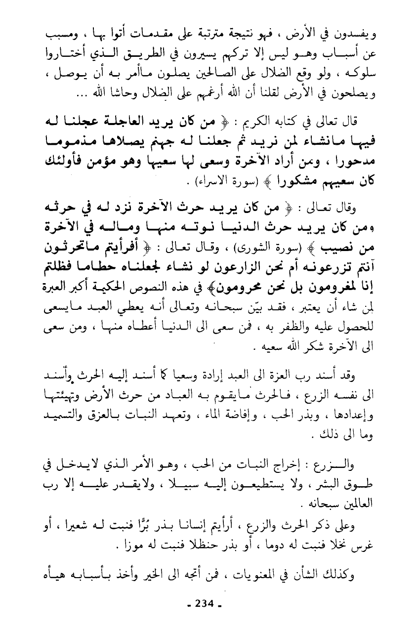 وقد أسند رب العزة الى العبد إرادة وسعيا كما أسند إليه الحرث وأسند الى نفسه الزرع، فالحرث ما يقوم به العباد من حرث الأرض وتهيئتها وإعدادها، وبذر الحب، وإفاضة الماء، وتعهد النبات بالعزق والتسميد وما الى ذلك.