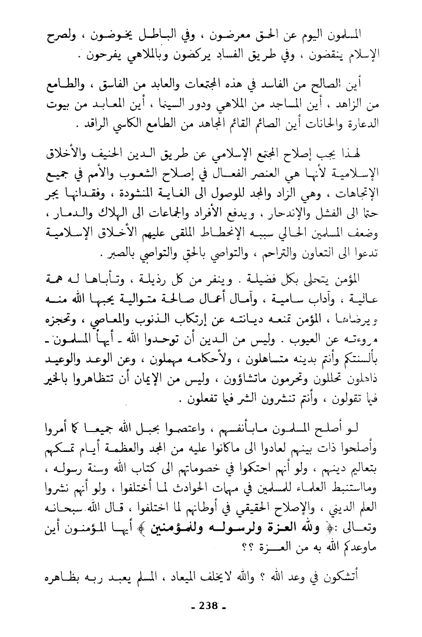 لو أصلح المسلمون ما بأنفسهم، واعتصموا بحبل الله جميعا كما أمروا وأصلحوا ذات بينهم لعادوا الى ما كانوا عليه من المجد والعظمة أيام تمسكهم بتعاليم دينهم، ولو أنهم احتكموا في خصوماتهم الى كتاب الله وسنة رسوله، وما استنبط العلماء للمسلمين في مهمات الحوادث لما اختلفوا، ولو أنهم نشروا العلم الديني، والإصلاح الحقيقي في أوطانهم لما اختلفوا، قال الله سبحانه وتعالى: {وَلِلَّهِ الْعِزَّةُ وَلِرَسُولِهِ وَلِلْمُؤْمِنِينَ} أيها المؤمنون أين ما وعدكم الله به من العزة؟؟