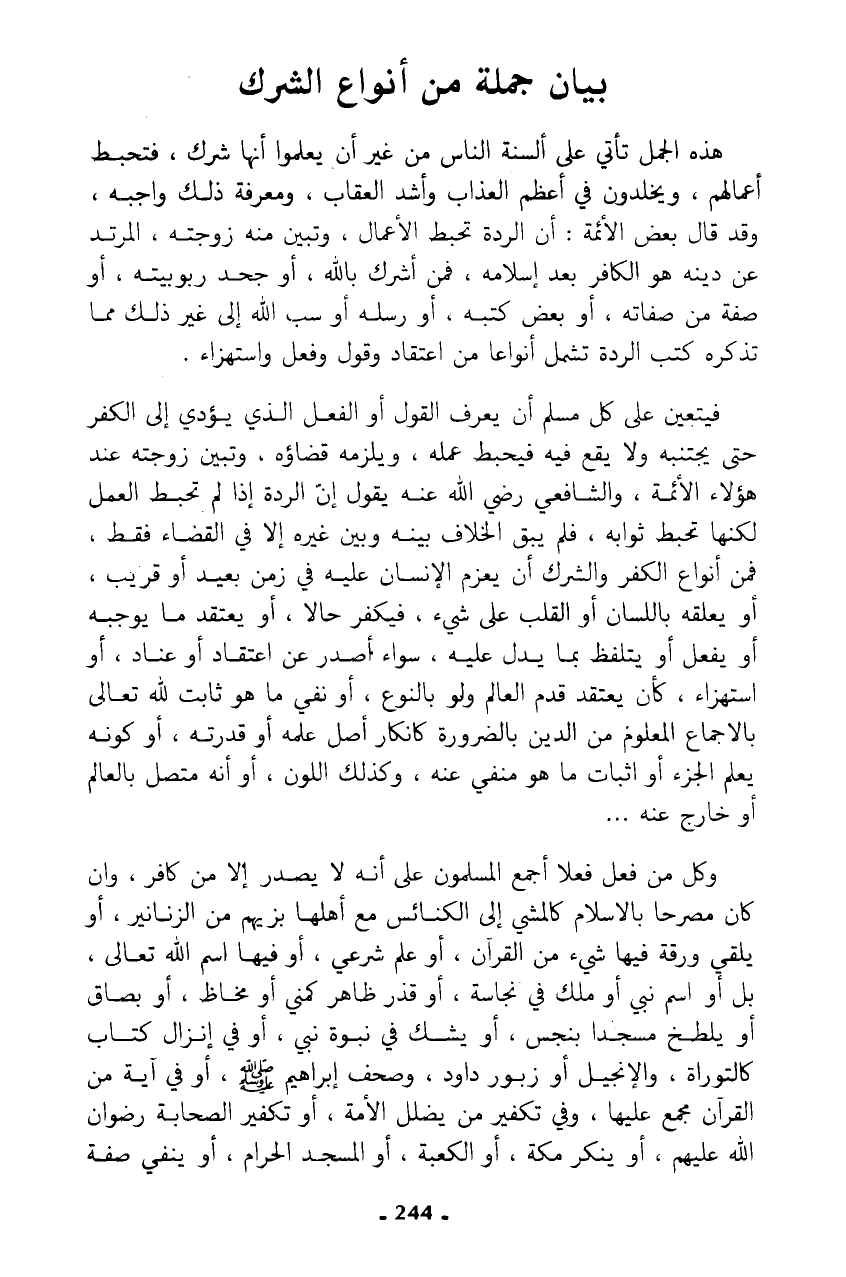 فيتعين على كل مسلم أن يعرف القول أو الفعل الذي يؤدي إلى الكفر حتى يجتنبه ولا يقع فيه فيحبط عمله، ويلزمه قضاؤه، وتبين زوجته عند هؤلاء الأئمة، والشافعي رضي الله عنه يقول إن الردة إذا لم تحبط العمل لكنها تحبط ثوابه، فلم يبق الخلاف بينه وبين غيره إلا في القضاء فقط، فمن أنواع الكفر والشرك أن يعزم الإنسان عليه في زمن بعيد أو قريب، أو يعلقه باللسان أو القلب على شيء، فيكفر حالا، أو يعتقد ما يوجبه أو يفعل أو يتلفظ بما يدل عليه، سواء أصدر عن اعتقاد أو عناد، أو استهزاء، كأن يعتقد قدم العالم ولو بالنوع، أو نفي ما هو ثابت لله تعالى بالإجماع المعلوم من الدين بالضرورة كإنكار أصل علمه أو قدرته، أو كونه يعلم الجزء أو اثبات ما هو منفي عنه، وكذلك اللون، أو أنه متصل بالعالم أو خارج عنه ...