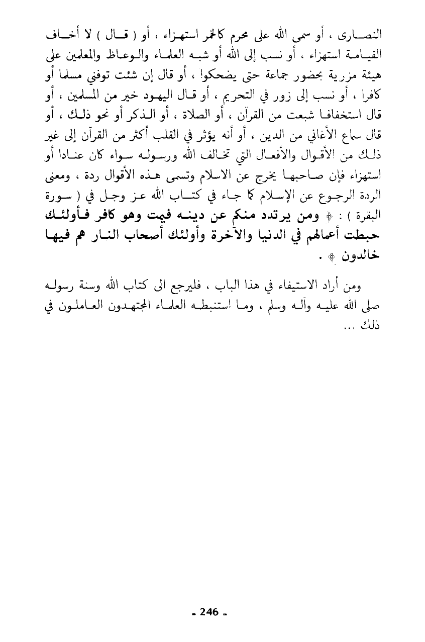 النصارى، أو سمى الله على محرم كالخمر استهزاء، أو (قال) لا أخاف القيامة استهزاء، أو نسب إلى الله أو شبه العلماء والوعاظ والمعلمين على هيئة مزرية بحضور جماعة حتى يضحكوا، أو قال إن شئت توفني مسلما أو كافرا، أو نسب إلى زور في التحريم، أو قال اليهود خير من المسلمين، أو قال استخفافا شبعت من القرآن، أو الصلاة، أو الذكر أو نحو ذلك، أو قال سماع الأغاني من الدين، أو أنه يؤثر في القلب أكثر من القرآن إلى غير ذلك من الأقوال والأفعال التي تخالف الله ورسوله سواء كان عنادا أو استهزاء فإن صاحبها يخرج عن الإسلام وتسمى هذه الأقوال ردة، ومعنى الردة الرجوع عن الإسلام كما جاء في كتاب الله عز وجل في (سورة البقرة): {وَمَنْ يَرْتَدِدْ مِنْكُمْ عَنْ دِينِهِ فَيَمُتْ وَهُوَ كَافِرٌ فَأُولَئِكَ حَبِطَتْ أَعْمَالُهُمْ فِي الدُّنْيَا وَالْآخِرَةِ وَأُولَئِكَ أَصْحَابُ النَّارِ هُمْ فِيهَا خَالِدُونَ}.