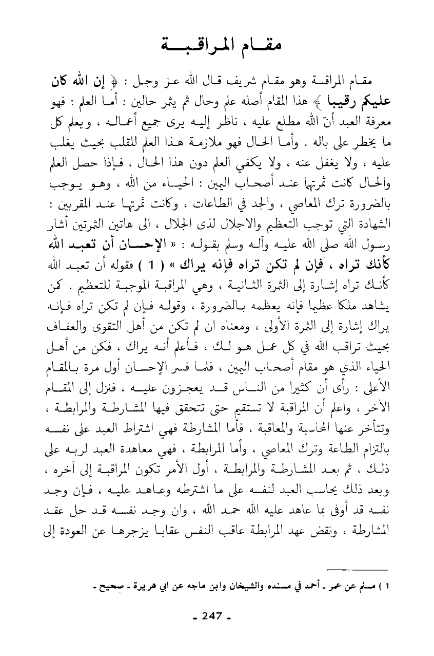 مقام المراقبة وهو مقام شريف قال الله عز وجل: {إِنَّ اللَّهَ كَانَ عَلَيْكُمْ رَقِيبًا} هذا المقام أصله علم وحال ثم يثمر حالين: أما العلم: فهو معرفة العبد أن الله مطلع عليه، ناظر إليه يرى جميع أعماله. ويعلم كل ما يخطر على باله. وأما الحال فهو ملازمة هذا العلم للقلب بحيث يغلب عليه، ولا يغفل عنه، ولا يكفي العلم دون هذا الحال، فإذا حصل العلم والحال كانت ثمرتهما عند أصحاب اليمين: الحياء من الله، وهو يوجب بالضرورة ترك المهاصي، والجد في الطاعات، وكانت ثمرتها عند المقربين: الشهادة التي توجب التعظيم والإجلال لذى الجلال، إلى هاتين الثمرتين أشار رسول الله صلى الله عليه وآله وسلم بقوله: "الإحسان أن تعبد الله كأنك تراه، فإن لم تكن تراه فإنه يراك" (¬1) فقوله أن تعبد الله كأنك تراه إشارة إلى الثمرة الثانية، وهي المراقبة الموجبة للتعظيم. كمن يشاهد ملكا عظيما فإنه يعظمه بالضرورة، وقوله فإن لم تكن تراه فإنه يراك إشارة إلى الثمرة الأولى، ومعناه إن لم تكن من أهل التقوى والعفاف بحيث تراقب الله في كل عمل هو لك، فاعلم أنه يراك، فكن من أهل الحياء الذي هو مقام أصحاب اليمين، فلما فسر الإحسان أول مرة بالمقام الأعلى: رأى أن كثيرا من الناس قد يعجزوان عليه، فنزل إلى المقام الآخر، واعلم أن المراقبة لا تستقيم حتى تتحقق فيها المشارطة والمرابطة، وتتأخر عنها المحاسبة والمعاقبة، فأما المشارطة فهي اشتراط العبد على نفسه بالتزام الطاعة وترك المعاصي، وأما المرابطة، فهي معاهدة العبد لربه على ذلك، ثم بعد المشارطة والمرابطة، أول الأمر تكون المراقبة إلى آخره، وبعد ذلك يحاسب العبد لنفسه على ما اشترطه وعاهد عليه، فإن وجد نفسه قد أوفى بما عاهد عليه الله حمد الله، وأن وجد نفسه قد حل عقد المشارطة، ونقض عهد المرابطة عاقب النفس عقابا يزجرها عن العودة إلى