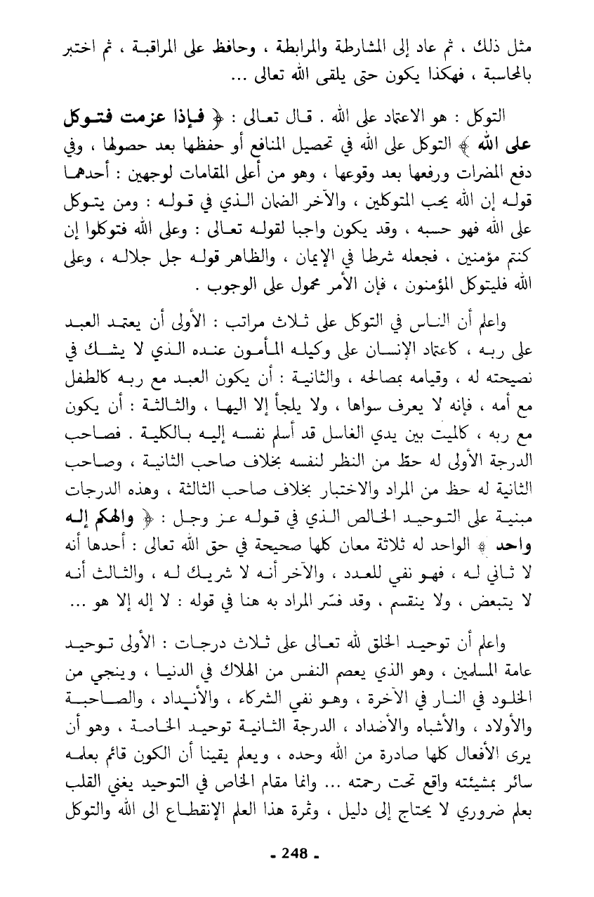 واعلم أن الناس في التوكل على ثلاث مراتب: الأولى أن يعتمد العبد على ربه، كاعتماد الإنسان على وكيله المأمون عنده الذي لا يشك في نصيحته له، وقيامه بمصالحه، والثانية: أن يكون العبد مع ربه كالطفل مع أمه، فإنه لا يعرف سواها، ولا يلجأ إلا إليها، والثالثة: أن يكون مع ربه، كالميت بين يدي الغاسل قد أسلم نفسه إليه بالكلية. فصاحب الدرجة الأولى له حظ من النظر لنفسه بخلاف صاحب الثانية، وصاحب الثانية له حظ من المراد والاختبار بخلاف صاحب الثالثة، وهذه الدرجات مبنية على التوحيد الخالص الذي في قوله عز وجل: {وَإِلَهُكُمْ إِلَهٌ وَاحِدٌ} الواحد له ثلاثة معان كلها صحيحة في حق الله تعالى: أحدها أنه لا ثاني له، فهو نفي للعدد، والآخر أنه لا شريك له، والثالث أنه لا يتبعض، ولا ينقسم، وقد فسر المراد به هنا في قوله: لا إله إلا هو ...