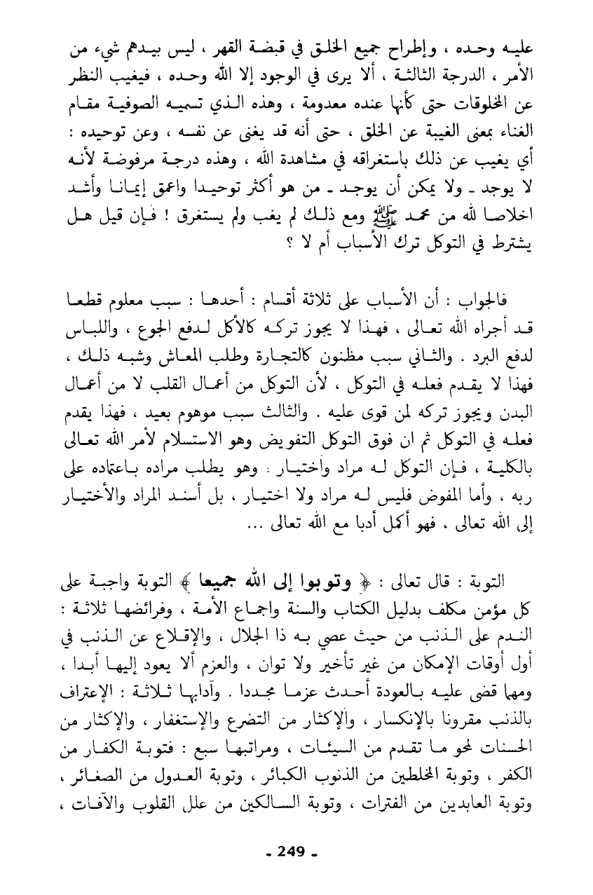 عليه وحده، وإطراح جميع الخلق في قبضة القهر، ليس بيدهم شيء من الأمر، الدرجة الثالثة، ألا يرى في الوجود إلا الله وحده، فيغيب النظر عن المخلوقات حتى كأنها عنده معدومة، وهذه الذي تسميه الصوفية مقام الغناء بمعنى الغيبة عن الخلق، حتى أنه قد يغني عن نفسه، وعن توحيده: أي يغيب عن ذلك باستغراقه في مشاهدة الله، وهذه درجة مرفوضة لأنه لا يوجد- ولا يمكن أن يوجد- من هو أكثر توحيدا وأعمق إيمانا وأشد إخلاصا لله من محمد - صلى الله عليه وسلم - ومع ذلك لم يغب ولم يستغرق! فإن قيل هل يشترط في التوكل ترك الأسباب أم لا؟