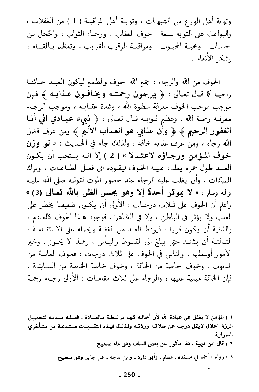 الخوف من الله والرجاء: جمع الله الخوف والطمع ليكون العبد خائفا راجيا كما قال تعالى: {يَرْجُونَ رَحْمَتَهُ وَيَخَافُونَ عَذَابَهُ} فإن موجب الخوف معرفة سطوة الله، وشدة عقابه، وموجب الرجاء معرفة رحمة الله، وعظيم ثوابه قال تعالى: {نَبِّئْ عِبَادِي أَنِّي أَنَا الْغَفُورُ الرَّحِيمُ} {وَأَنَّ عَذَابِي هُوَ الْعَذَابُ الْأَلِيمُ} ومن عرف فضل الله رجاه، ومن عرف عذابه خافه، ولذلك جاء في الحديث: "لو وزن خوف المؤمن ورجاؤه لاعتدلا" (¬2) إلا أنه يستحب أن يكون العبد طول عمره يغلب عليه الخوف ليقوده إلى فعل الطاعات، وترك السيئات، وأن يغلب عليه الرجاء عند حضور الموت لقوله صلى الله عليه وآله وسلم: "لا يموتن أحدكم إلا وهو يحسن الظن بالله تعالى (¬3) " واعلم أن الخوف على ثلاث درجات: الأولى أن يكون ضعيفا يخطر على القلب ولا يؤثر في الباطن، ولا في الظاهر، فوجود هذا الخوف كالعدم، والثانية أن يكون قويا: فيوقظ العبد من الغفلة ويحمله على الاستقامة، الثالثة أن يشتد حتى يبلغ الى القنوط واليأس، وهذا لا يجوز، وخير الأمور أوسطها، والناس في الخوف على ثلاث درجات: فخوف العامة من الذنوب، وخوف الخاصة من الخاتمة، وخوف خاصة الخاصة من السابقة، فإن الخاتمة مبنية عليها، والرجاء على ثلاث مقامات: الأولى رجاء رحمة