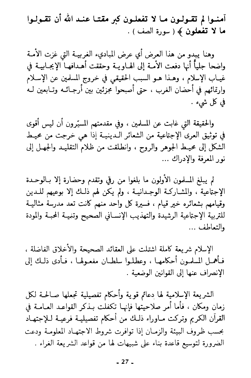 الإسلام شريعة كاملة اشتملت على العقائد الصحيحة والأخلاق الفاضلة، فأهمل المسلمون أحكامها، وعطلوا سلطان مفعولها، فأدى ذلك إلى الإنصراف عنها إلى القوانين الوضعية.