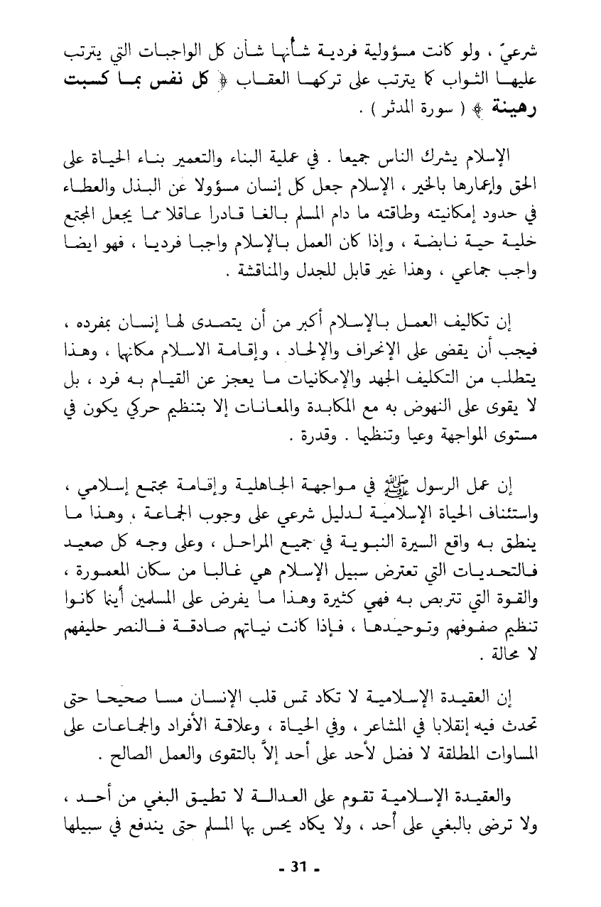 شرعي، ولو كانت مسؤولية فردية شأنها شأن كل الواجبات التي يترتب عليها الثواب كما يترتب على تركها العقاب {كُلُّ نَفْسٍ بِمَا كَسَبَتْ رَهِينَةٌ} (سورة المدثر).