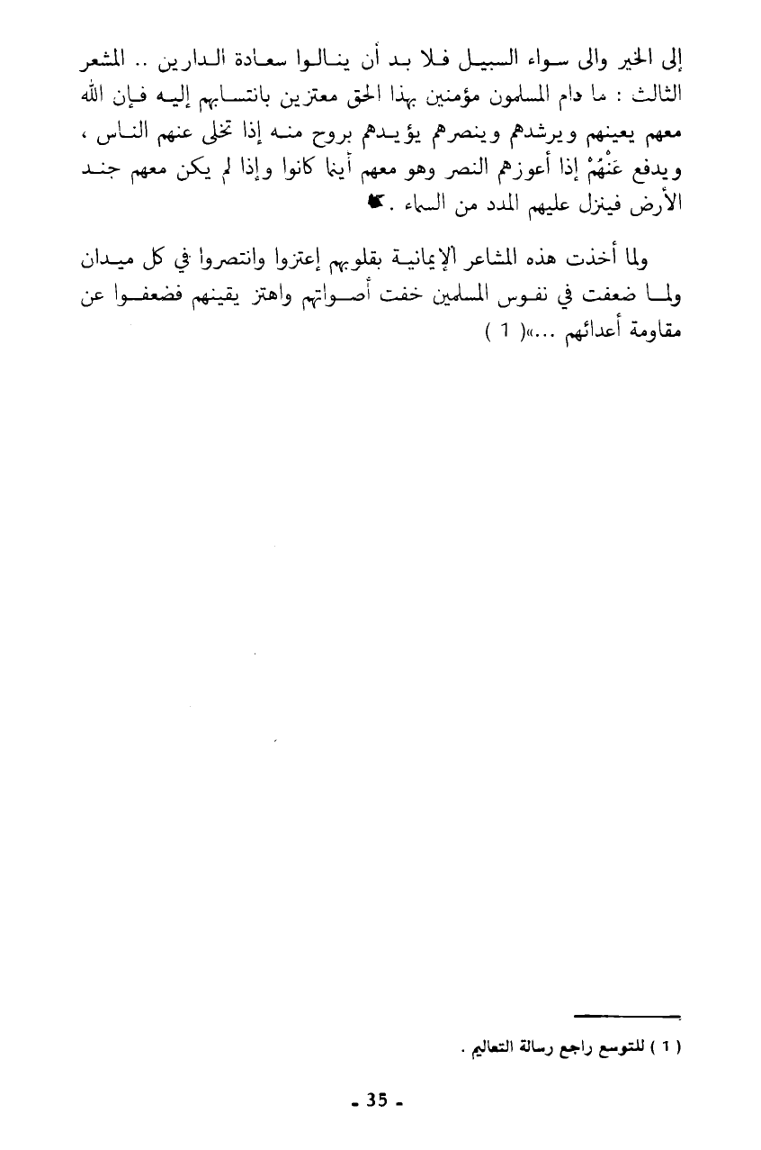 ولما أخذت هذه المشاعر الإيمانية بقلوبهم إعتزوا وانتصروا في كل ميدان ولما ضعفت في نفوس المسلمين أصواتهم واهتز يقينهم فضعفوا عن مقاومة أعدائهم ... " (¬1).