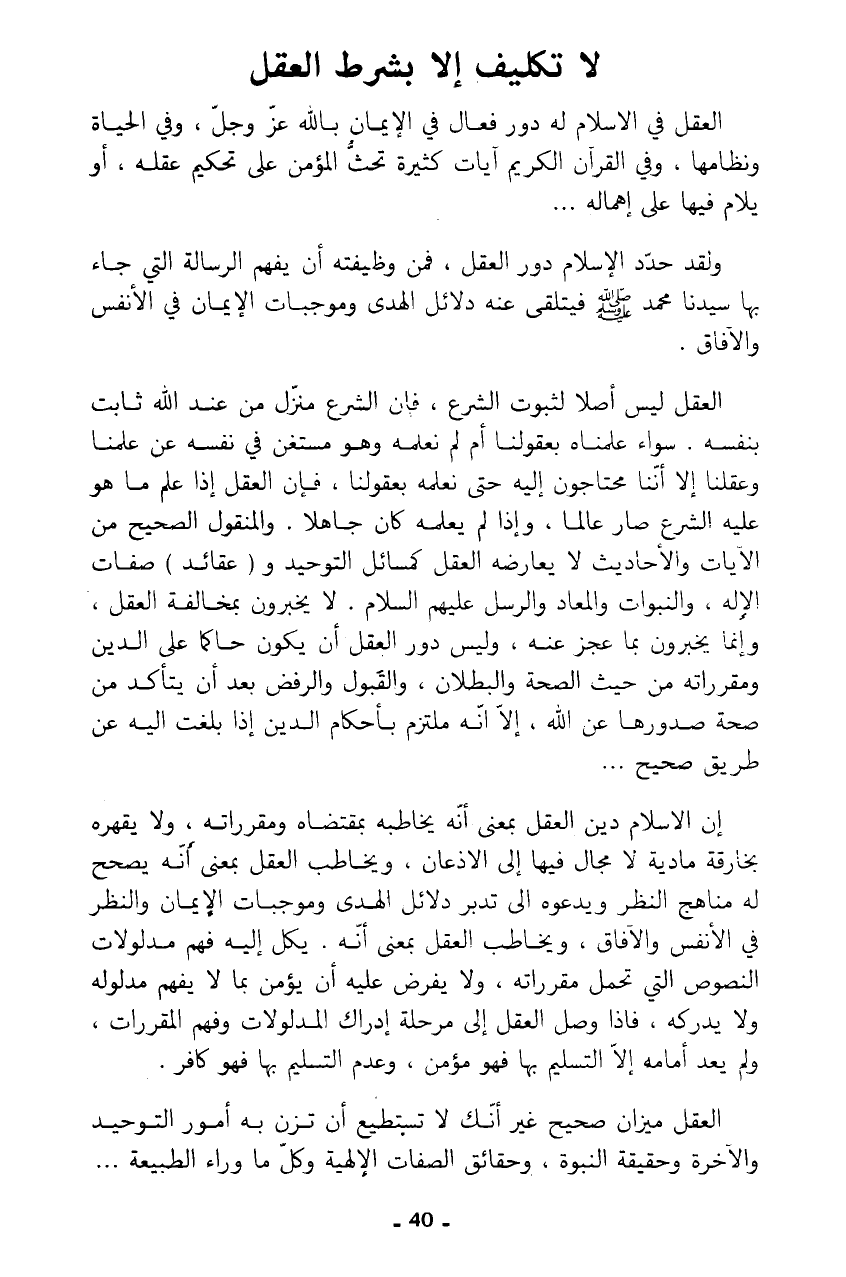 إن الإسلام دين العقل بمعنى أنه يخاطبه بمقتضاه ومقرراته، ولا يقهره بخارقة مادية لا مجال فيها إلى الإذعان، ويخاطب العقل بمعنى أنه يصحح له مناهج النظر ويدعوه إلى تدبر دلائل الهدى وموجبات الإيمان والنظر في الأنفس والآفاق، ويخاطب العقل بمعنى أنه يكل إليه فهم مدلولات النصوص التي تحمل مقرراته، ولا يفرض عليه أن يؤمن بما لا يفهم مدلوله ولا يدركه، فإذا وصل العقل إلى مرحلة إدراك المدلولات وفهم المقررات، ولم يعد أمامه إلا التسليم بها فهو مؤمن، وعدم التسليم بها فهو كافر.