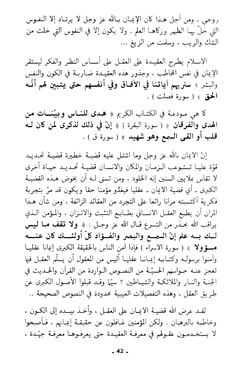 روحي، ومن أجل هذا كان الإيمان بالله عز وجل لا يرتاد إلا النفوس التي حل بها الطهر وزكاها العلم، ولا يكودما إلا في النفوس التي خلت من الشك والريب، وسلمت من الزيغ ...