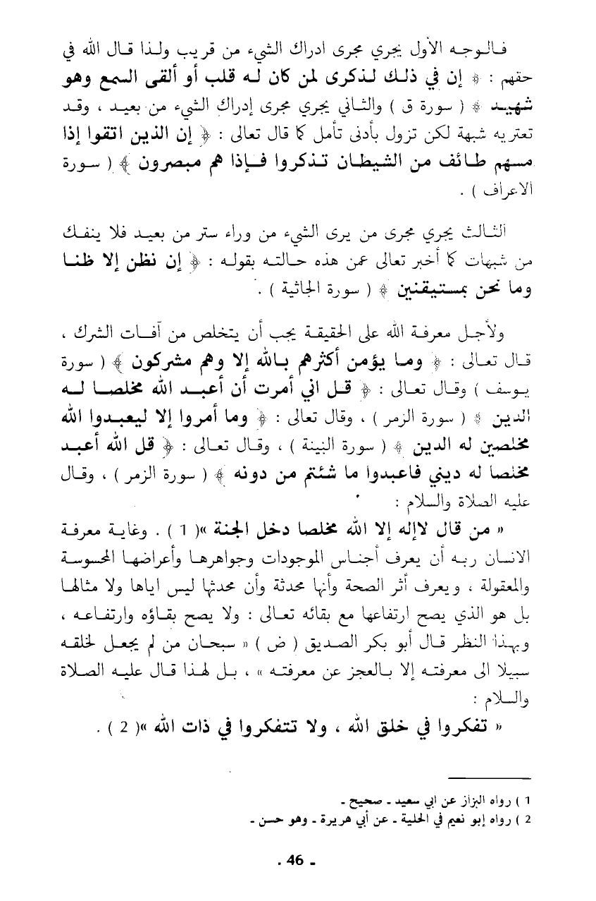 ولأجل معرفة الله على الحقيقة يجب أن يتخلص من آفات الشرك، قال تعالى: {وَمَا يُؤْمِنُ أَكْثَرُهُمْ بِاللَّهِ إِلَّا وَهُمْ مُشْرِكُونَ} (سورة يوسف) وقال تعالى: {قُلْ إِنِّي أُمِرْتُ أَنْ أَعْبُدَ اللَّهَ مُخْلِصًا لَهُ الدِّينَ} (سورة الزمر)، وقال تعالى: {وَمَا أُمِرُوا إِلَّا لِيَعْبُدُوا اللَّهَ مُخْلِصِينَ لَهُ الدِّينَ} (سورة البينة)، وقال تعالى: {قُلِ اللَّهَ أَعْبُدُ مُخْلِصًا لَهُ دِينِي * فَاعْبُدُوا مَا شِئْتُمْ مِنْ دُونِهِ} (سورة الزمر)، وقال عليه الصلاة والسلام: "من قال لا إله إلا الله مخلصا دخل الجنة" (¬1). وغاية معرفة الانسان ربه أن يعرف أجناس الموجودات وجواهرها وأعراضها المحسوسة والمعقولة، ويعرف أثر الصحة وأنها محدثة وأن محدثها ليس إياها ولا مثالها بل هو الذي يصح ارتفاعها مع بقائه تعالى: ولا يصح بقاؤه وارتفاعه، وبهذا النطر قال أبو بكر الصديق (ض) "سبحان من لم يجعل لخلقه سبيلا إلى معرفته إلا بالعجز عن معرفته"، بل لهذا قال عليه الصلاة والسلام: "تفكروا في خلق الله، ولا تتقكروأ في ذات الله" (¬2).