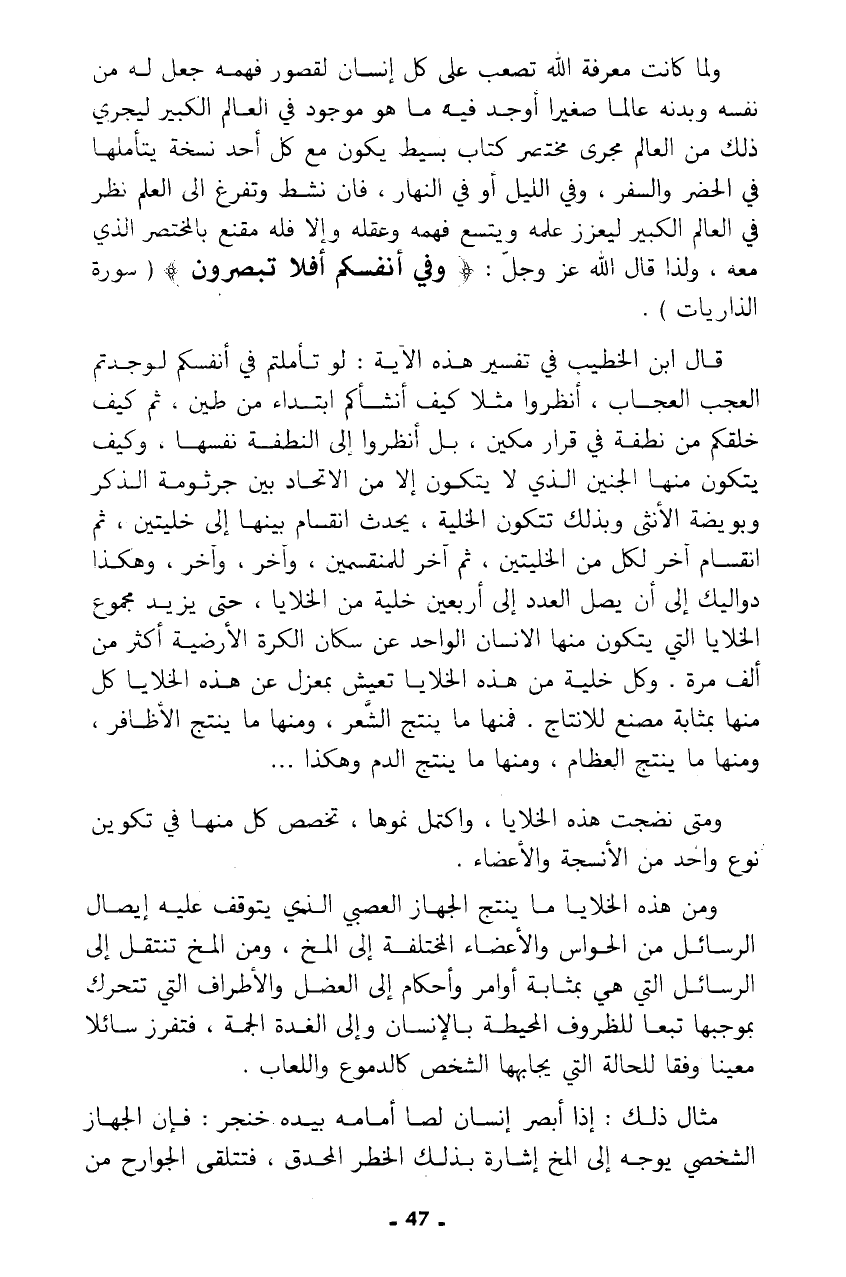 قال ابن الخطيب في تفسير هذه الآية: لو تأملتم في أنفسكم لوجدتم العجب العجاب، أنظروا مثلا كيف أنشأكم ابتداء من طين، ثم كيف خلقكم من نطفة في قرار مكين، بل أنظروا إلى النطفة نفسها، وكيف يتكون منها الجنين الذي لا يتكون إلا من الاتحاد بين جرثومة الذكر وبويضة الأنثى وبذلك تتكون الخلية، يحدث انقسام بينها إلى خليتين، ثم انقسام آخر لكل من الخليتين، ثم آخر للمنقسمين، وآخر، وآخر، وهكذا دواليك إلى أن يصل العدد إلى أربعين خلية من الخلايا، حتى يزيد مجموع الخلايا التي يتكون منها الإنسان الواحد عن سكان الكرة الأرضية أكثر من ألف مرة. وكل خلية من هذه الخلايا تعيش بمعزل عن هذه الخلايا كل منها بمثابة مصنع للإنتاج. فمنها ما ينتج الشعر، ومنها ما ينتج الأظافر، ومنها ما ينتج العظام، ومنها ما ينتج الدم وهكذا ...