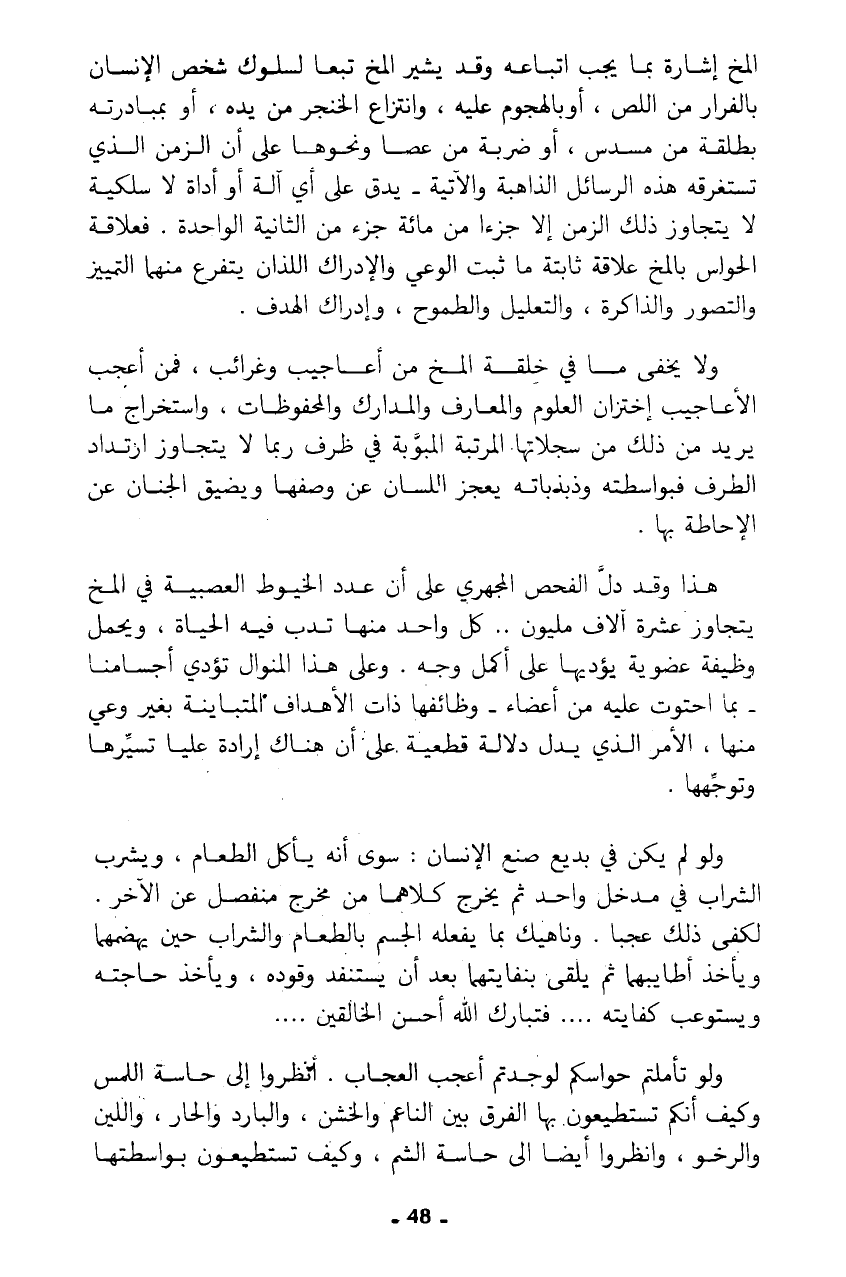 هذا وقد دل الفحص المجهري على أن عدد الخيوط العصبية في المخ يتجاوز عشرة آلاف مليون .. كل واحد منها تدب فيه الحياة، ويحمل وظيفة عضوية يؤديها على أكمل وجه. وعلى هذا المنوال تؤدي أجسامنا - بما احتوت عليه من أعضاء- وظائفها ذات الأهداف المتباينة بغير وعي منها، الأمر الذي يدل دلالة قطعية، على أن هناك إرادة عليا تسيرها وتوجهها.