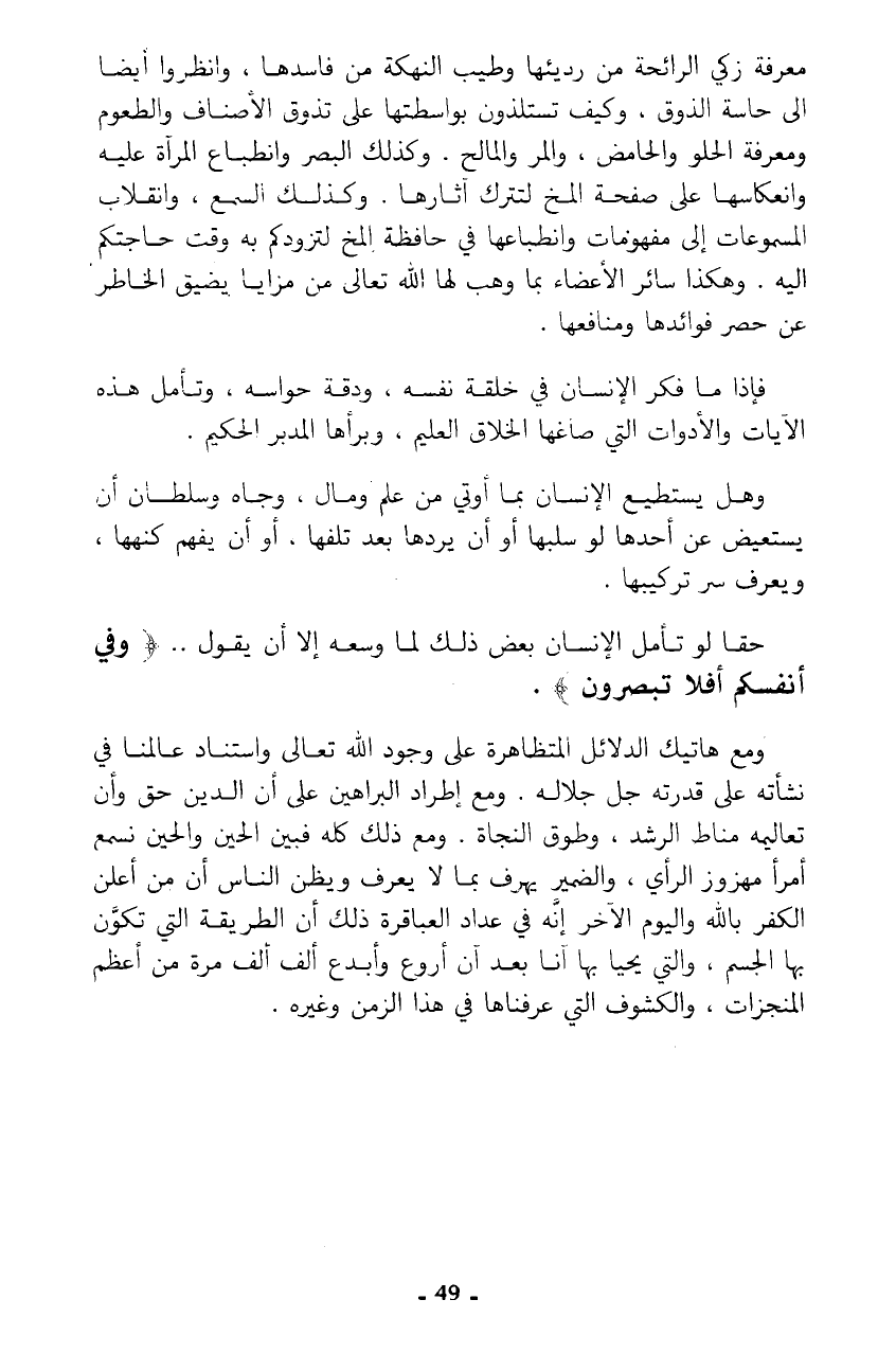 معرفة زكي الرائحة من رديئها وطيب النهكة من فاسدها، وانظروا أيضا إلى حاسة الذوق، وكيف تستلذون بواسطتها على تذوق الأصناف والطعوم ومعرفة الحلو والحامض، والمر والمالح. وكذلك البصر وانطباع المرآة عليه وانعكاسها على صفحة المخ لتترك آثارها. وكذلك السمع، وانقلاب المسموعات إلى مفهومات وانطباعها في حافظة المخ لتزوكم به وقت حاجتكم إليه. وهكذا سائر الأعضاء بما وهب لها الله تعالى من مزايا يضيق الخاطر عن حصر فوائدها ومنافعها.