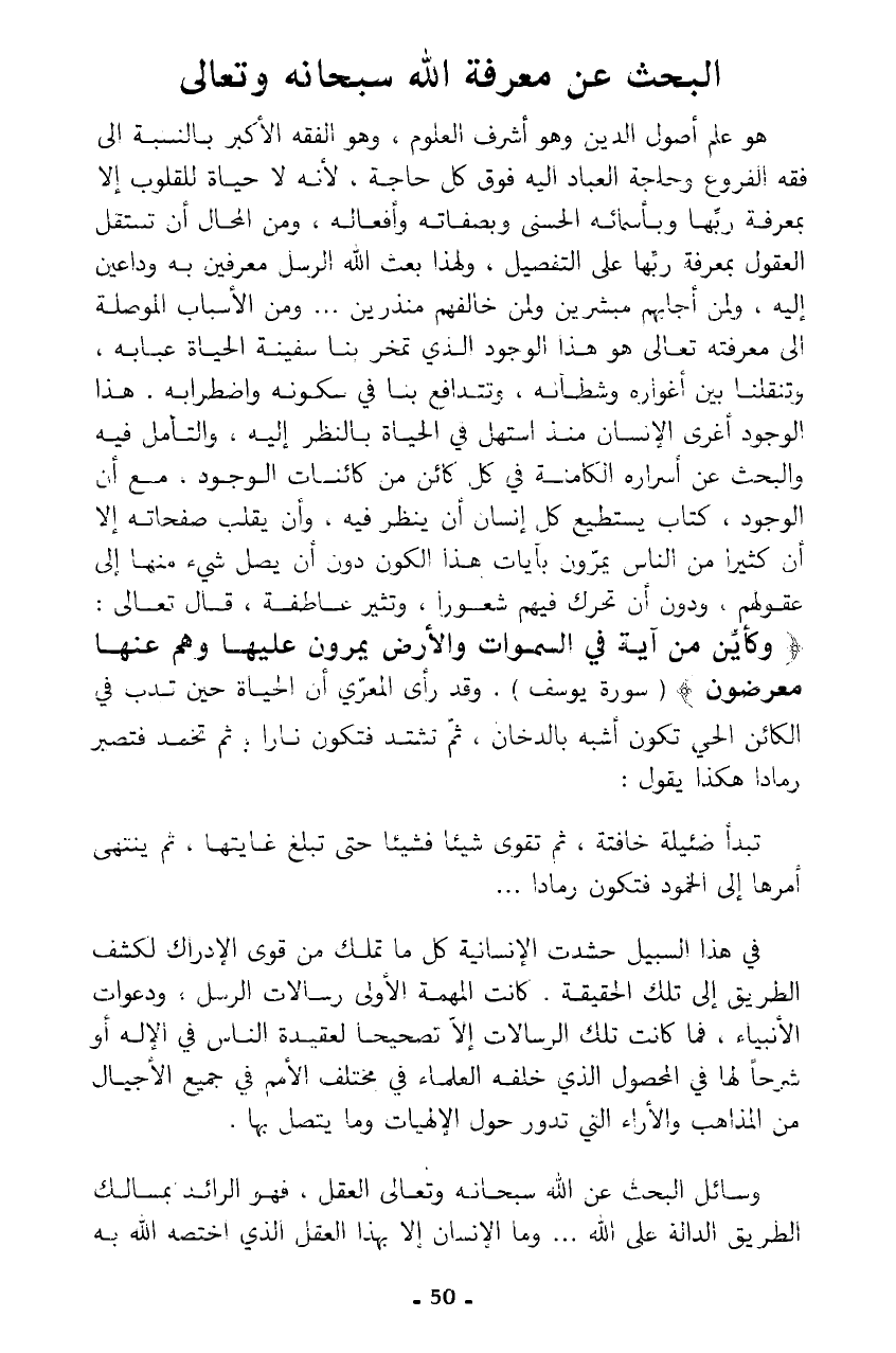 هو علم أصول الدين وهو أشرف العلوم، وهو الفقه الأكبر بالنسبة إلى فقه الفروع وحاجة العباد إليه فوق كل حاجة، لأنه لا حياة للقلوب إلا بمعرفة ربها وبأسمائه الحسنى وبصفاته وأفعاله، ومن المحال أن تستقل العقول بمعرفة ربها على التفصيل، ولهذا بعث الله الرسل معرفين به وداعين إليه، ولمن أجابهم مبشرين ولمن خالفهم منذرين ... ومن الأسباب الموصلة إلى معرفته تعالى هو هذا الوجود الذي تمخر بنا سفينة الحياة عبابه، وتنقلنا بين أغواره وشطآنه، وتتدافع بنا في سكونه واضطرابه. هذا الوجود أغرى الإنسان منذ استهل في الحياة بالنظر إليه، والتأمل فيه والبحث عن أسراره الكامنة في كل كائن من كائنات الوجود، مع أن الوجود، كتاب يستطيع كل إنسان أن ينظر فيه، وأن يقلب صفحاته إلا أن كثيرا من الناس يمرون بآيات هذا الكون دون أن يصل شيء منها إلى عقولهم، ودون أن تحرك فيهم شعورا، وتثير عاطفة، قال تعالى: {وَكَأَيِّنْ مِنْ آيَةٍ فِي السَّمَاوَاتِ وَالْأَرْضِ يَمُرُّونَ عَلَيْهَا وَهُمْ عَنْهَا مُعْرِضُونَ} (سورة يوسف). وقد رأى المعري أن الحياة حين تدب في الكائن الحي تكون أشبه بالدخان، ثم تشتد فتكون نارا، ثم تخمد فتصير رمادا هكذا يقول: تبدأ ضئيلة خافتة، ثم تقوى شيئا فشيئا حتى تبلغ غايتها، ثم ينتهي أمرها إلى الخمود فتكون رمادا ...