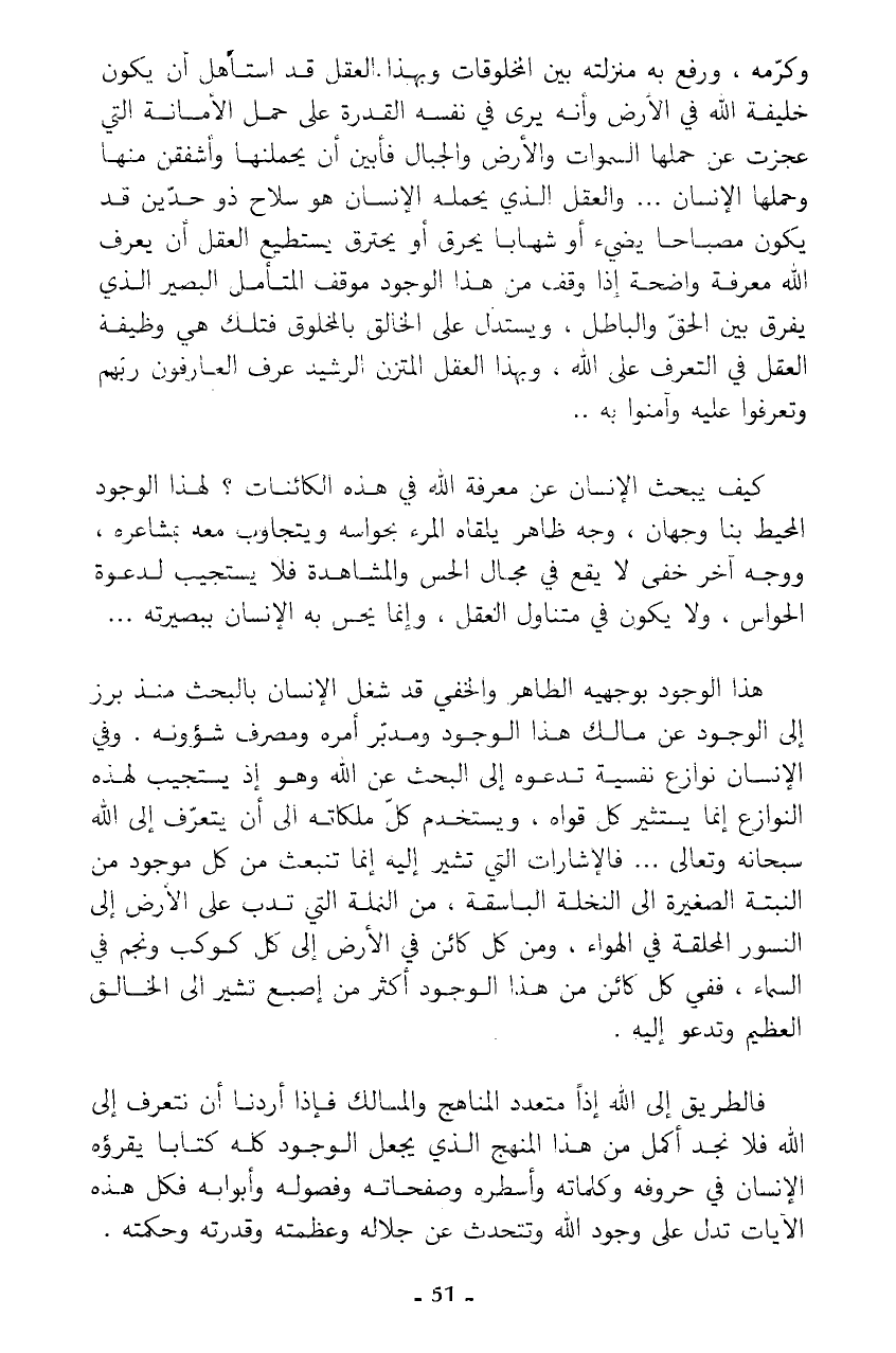 هذا الوجود بوجهيه الظاهر والخفي قد شغل الإنسان بالبحث منذ برز إلى الوجود عن مالك هذا الوجود ومدبر أمره ومصرف شؤونه. وفي الإنسان نوازع نفسية تدعوه إلى البحث عن الله وهو إذ يستجيب لهذه النوازع إنما يستثير كل قواه، ويستخدم كل ملكاته إلى أن يتعرف إلى الله سبحانه وتعالى ... فالإشارات التي تشير إليه إنما تنبعث من كل موجود من النبتة الصغيرة إلى النخلة الباسقة، من النملة التي تدب على الأرض إلى النسور المحلقة في الهواء، ومن كل كائن في الأرض إلى كل كوكب ونجم في السماء، ففي كل كائن من هذا الوجود أكثر من إصبع تشير إلى الخالق العظيم وتدعو إليه.
