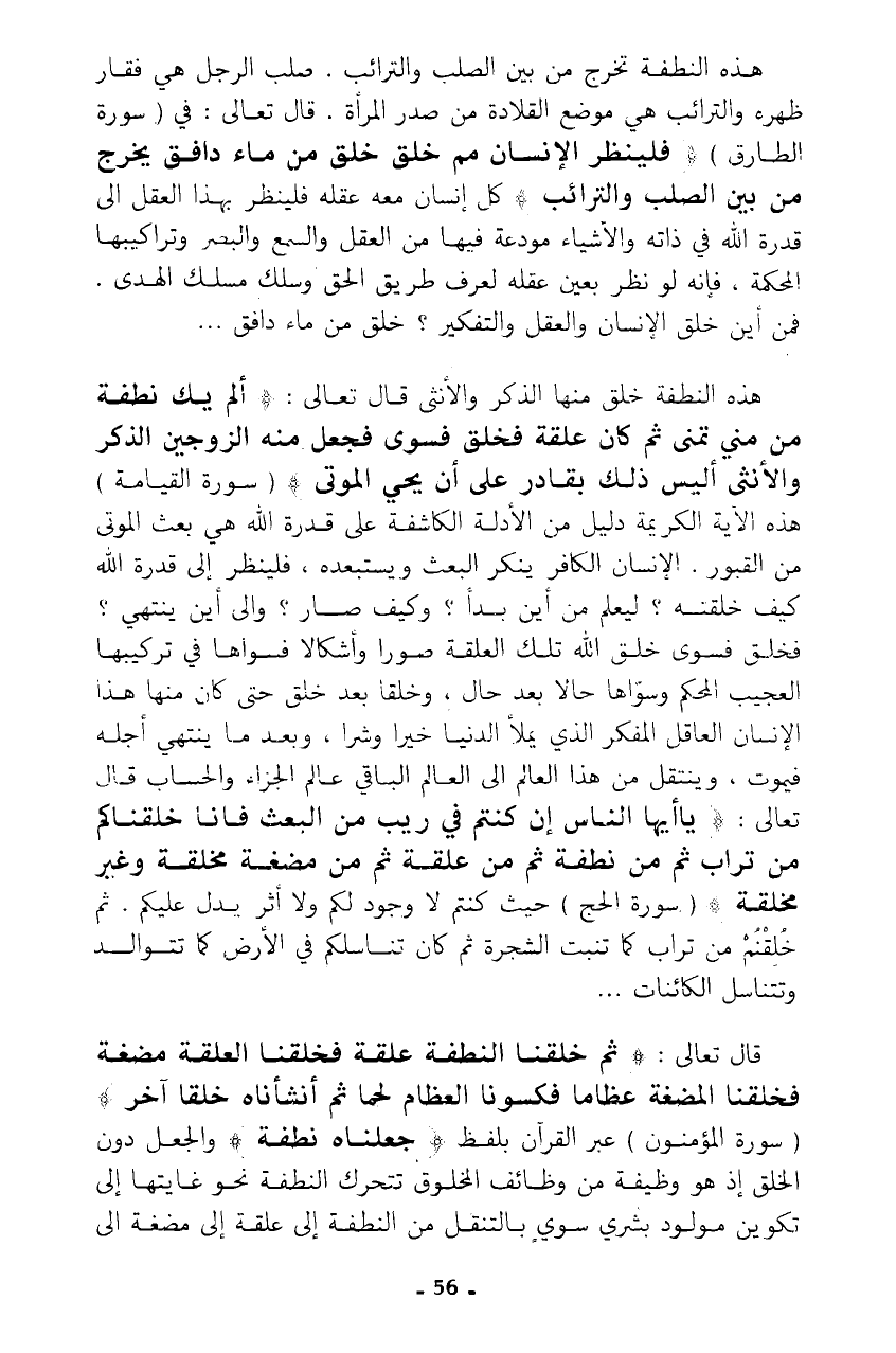 هذه النطفة تخرج من بين الصلب والترائب. صلب الرجل هي فقار ظهره والترائب هي موضع القلادة من صدر المرأة. قال تعالى: في (سورة الطارق) {فَلْيَنْظُرِ الْإِنْسَانُ مِمَّ خُلِقَ * خُلِقَ مِنْ مَاءٍ دَافِقٍ * يَخْرُجُ مِنْ بَيْنِ الصُّلْبِ وَالتَّرَائِبِ} كل إنسان معه عقله فلينظر بهذا العقل إلى قدرة الله في ذاته والأشياء مودعة فيها من العقل والسمع والبصر وتراكيبها المحكمة، فإنه لو نظر بعين عقله لعرف طريق الحق وسلك مسلك الهدى فمن أين خلق الإنسان والعقل والتفكير؟ خلق من ماء دافق ...
