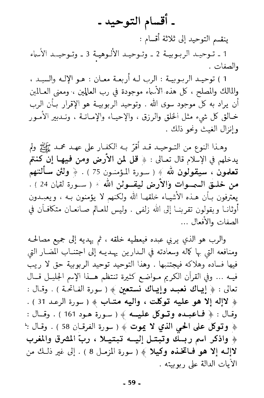 1 - توحيد الربوبية 2 - وتوحيد الألوهية 3 - وتوحيد الأسماء والصفات.