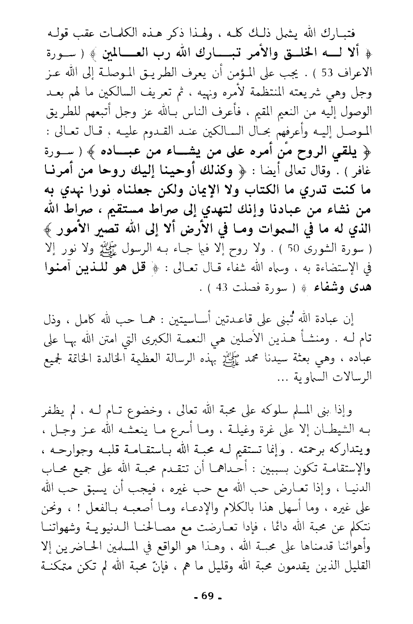 فتبارك الله يشمل ذلك كله، ولهذا ذكر هذه الكلمات عقب قوله {أَلَا لَهُ الْخَلْقُ وَالْأَمْرُ تَبَارَكَ اللَّهُ رَبُّ الْعَالَمِينَ} (سورة الأعراف 53). يجب على المؤمن أن يعرف الطريق الموصلة إلى الله عز وجل وهي شريعته المنتظمة لأمره ونهيه، ثم تعريف السالكين ما لهم بعد الوصول إليه من النعيم المقيم، فأعرف الناس بالله عز وجل أتبعهم للطريق الموصل إليه وأعرفهم بحال السالكين عند القدوم عليه، قال تعالى: {يُلْقِي الرُّوحَ مِنْ أَمْرِهِ عَلَى مَنْ يَشَاءُ مِنْ عِبَادِهِ} (سورة غافر). وقال تعالى أيضا: {وَكَذَلِكَ أَوْحَيْنَا إِلَيْكَ رُوحًا مِنْ أَمْرِنَا مَا كُنْتَ تَدْرِي مَا الْكِتَابُ وَلَا الْإِيمَانُ وَلَكِنْ جَعَلْنَاهُ نُورًا نَهْدِي بِهِ مَنْ نَشَاءُ مِنْ عِبَادِنَا وَإِنَّكَ لَتَهْدِي إِلَى صِرَاطٍ مُسْتَقِيمٍ * صِرَاطِ اللَّهِ الَّذِي لَهُ مَا فِي السَّمَاوَاتِ وَمَا فِي الْأَرْضِ أَلَا إِلَى اللَّهِ تَصِيرُ الْأُمُورُ} (سورة الشورة 50). ولا روح إلا فيما جاء به الرسول - صلى الله عليه وسلم - ولا نور إلا في الإستضاءة به، وسماه الله شفاء قال تعالى: {قُلْ هُوَ لِلَّذِينَ آمَنُوا هُدًى وَشِفَاءٌ} (سورة فصلت 43).