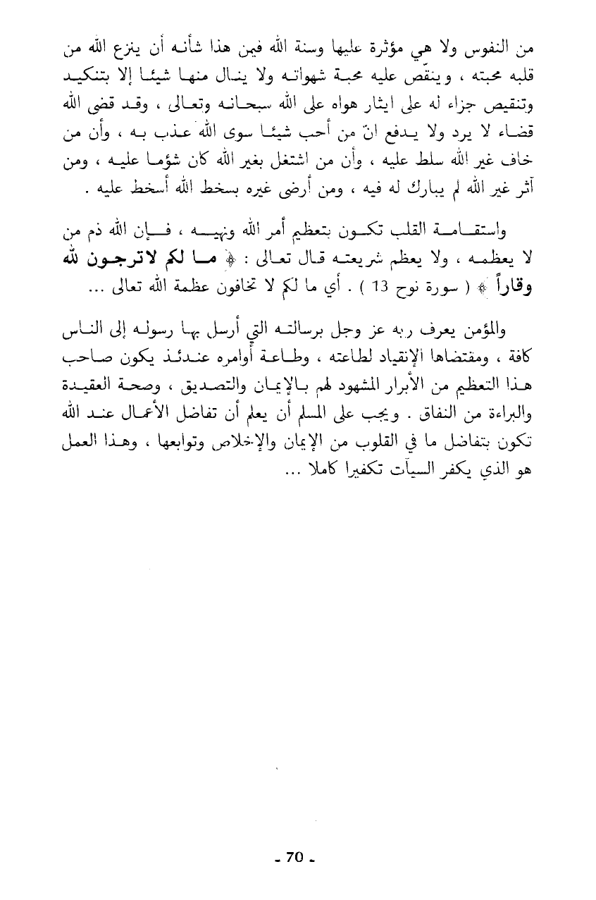 واستقامة القلب تكون بتعظيم أمر الله ونهيه، فإن الله ذم من لا يعظمه، ولا يعظم شريعته قال تعالى: {مَا لَكُمْ لَا تَرْجُونَ لِلَّهِ وَقَارًا} (سورة نوح 13). أي ما لم لا تخافون عظمة الله تعالى ...