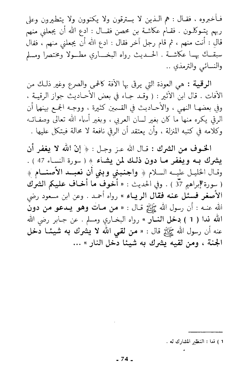 فأخبروه، فقال: هم الذين لا يسترقون ولا يكتوون ولا يتطيرون وعلى ربهم يتوكلون. فقام عكاشة بن محصن فقال: ادع الله أن يجعلني منهم قال: أنت منهم، ثم قام رجل آخر فقال: ادع الله أن يجعلني منهم، فقال سبفك بها عكاشة. الحديث رواه البخاري مطلولا ومختصرا ومسلم والنسائي والترمذي ..
