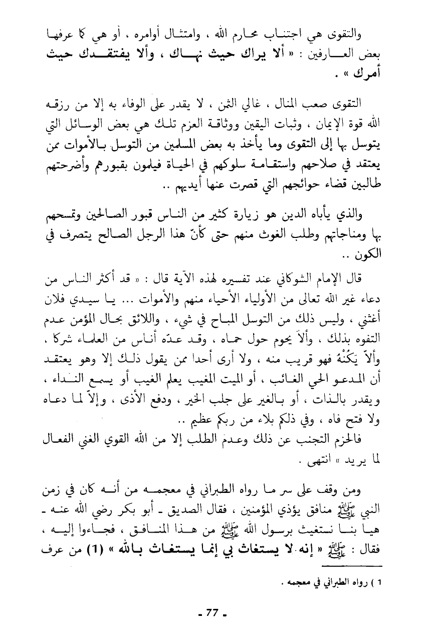 وكما وقف على سر ما رواه الطبراني في معجمه من أنه كان في زمن النبي - صلى الله عليه وسلم - منافق يؤذي المؤمنين، فقال الصديق- أبو بكر رضي الله عنه- هيا بنا نستغيث برسول الله - صلى الله عليه وسلم - من هذا المنافق، فجاءوا إليه، فقال: - صلى الله عليه وسلم - "إنه لا يستغاث بي إنما يستغاث بالله" (¬1) من عرف