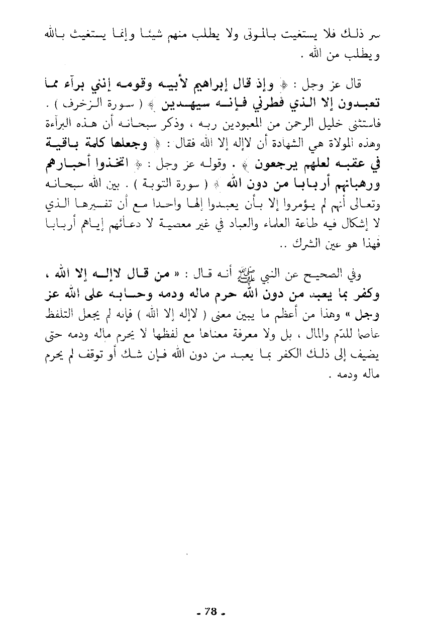 فاستثنى خليل الرحمن من المعبودين ربه، وذكر سبحانه أن هذه البرآءة وهذه المولاة هي الشهادة أن لا إله إلا الله فقال: {وَجَعَلَهَا كَلِمَةً بَاقِيَةً فِي عَقِبِهِ لَعَلَّهُمْ يَرْجِعُونَ}. وقوله عز وجل: {اتَّخَذُوا أَحْبَارَهُمْ وَرُهْبَانَهُمْ أَرْبَابًا مِنْ دُونِ اللَّهِ} (سورة التوبة). بين الله سبحانه وتعالى أنهم لم يؤمروا إلا بأن يعبدوا إلها واحدا مع أن تفسيرها الذي لا إشكال فيه طاعة العلماء والعباد في غير معصية لا دعائهم إياهم أربابا فهذا هو عين الشرك ..