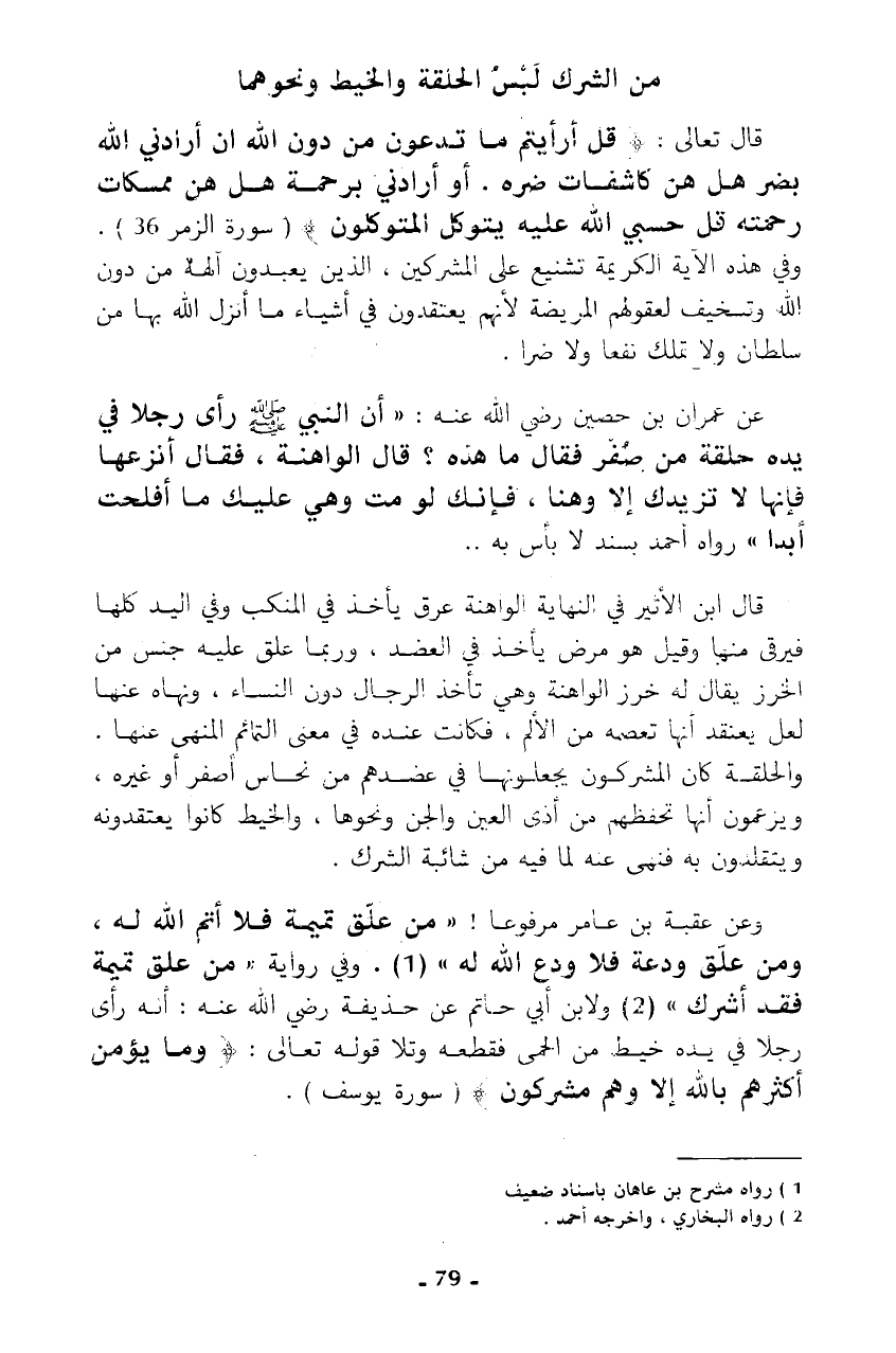 وعن عقبة بن عامر مرفوعا! "من علق تميمة فلا أتم الله له، ومن علق ودعة فلا ودع الله له" (¬1). وفي رواية "من علق تميمة فقط أشرك" (¬2) ولابن أبي حاتم عن حذيفة رضي الله عنه: أنه رأى رجلا في يده خيط من الحمى فقطعه وتلا قوله تعالى: {وَمَا يُؤْمِنُ أَكْثَرُهُمْ بِاللَّهِ إِلَّا وَهُمْ مُشْرِكُونَ} (سورة يوسف).