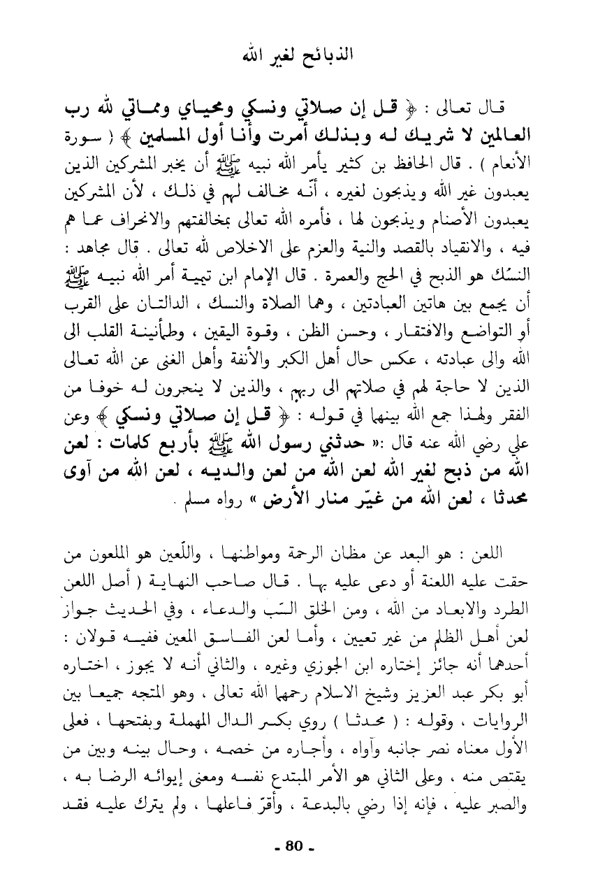 قال تعالى: {قُلْ إِنَّ صَلَاتِي وَنُسُكِي وَمَحْيَايَ وَمَمَاتِي لِلَّهِ رَبِّ الْعَالَمِينَ * لَا شَرِيكَ لَهُ وَبِذَلِكَ أُمِرْتُ وَأَنَا أَوَّلُ الْمُسْلِمِينَ} (سورة الأنعام). قال الحافظ بن كثير يأمر الله نبيه - صلى الله عليه وسلم - أن يخبر المشركين الذين يعبدون غير الله ويذبحون لغيره، أنه مخالف لهم في ذلك، لأن المشركين يعبدون الأصنام ويذبحون لها، فأمره الله تعالى بمخالفتهم والانحراف عما هم فيه، والانقياد بالقصد والنية والعزم على الاخلاص لله تعالى. قال مجاهد: النسك هو الذبح في الحج والعمرة. قال الإمام ابن تيمية أمر الله نبيه - صلى الله عليه وسلم - أن يجمع بين هاتين العبادتين، وهما الصلاة والنسك، الدالتان على القرب أو التواضع والافتقار، وحسن الظن، وقوة اليقين، وطمأنينة القلب إلى الله وإلى عبادته، عكس حال أهل الكبر والأنفة وأهل الغنى عن الله تعالى الذين لا حاجة لهم في صلاتهم إلى ربهم، والذين لا ينحرون له خوفا من الفقر ولهذا جمع الله بينهما في قوله: {قُلْ إِنَّ صَلَاتِي وَنُسُكِي} وعن علي رضي الله عنه قال: "حدثني رسول الله - صلى الله عليه وسلم - بأربع كلمات: لعن الله من ذبح لغير الله لعن الله من لعن والديه، لعن الله من آوى محدثا، لعن الله من غير منار الأرض" رواه مسلم.