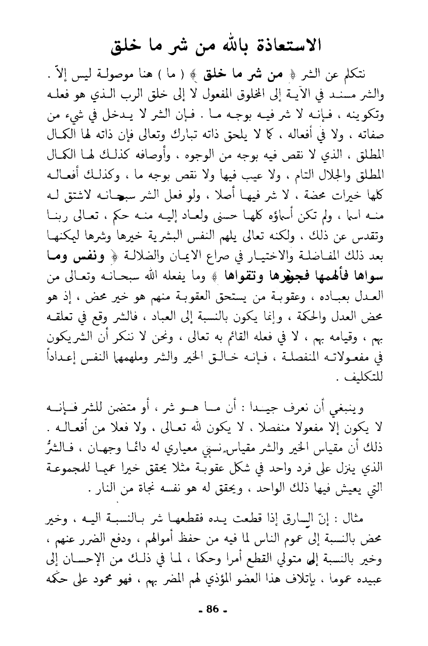 نتكلم عن الشر {مِنْ شَرِّ مَا خَلَقَ} (ما) هنا موصولة ليس إلا. والشر مسند في الآية إلى المخلوق المفعول لا إلى خلق الرب الذي هو فعله وتكوينه، فإنه لا شر فيه بوجه ما. فإن الشر لا يدخل في شيء من صفاته، ولا في أفعاله، كما لا يلحق ذاته تبارك وتعالى فإن ذاته لها الكمال المطلق، الذي لا نقص فيه بوجه من الوجوه، وأوصافه كذلك لها الكمال المطلق والجلال التام، ولا عيب فيها ولا نقص بوجه ما، وكذلك أفعاله كلها خيرات محضة، لا شر فيها أصلا، ولو فعل الشر سبحانه لاشتق له منه اسما، ولم تكن أسماؤه كلها حسنى ولعاد إليه منه حكم، تعالى ربنا وتقدس عن ذلك، ولكنه تعالى يلهم النفس البشرية خيرها وشرها ليمكنها بعد ذلك المفاضلة والاختيار في صراع الإيمان والضلالة {وَنَفْسٍ وَمَا سَوَّاهَا * فَأَلْهَمَهَا فُجُورَهَا وَتَقْوَاهَا} وما يفعله الله سبحانه وتعالى من العدل بعباده، وعقوبة من يستحق العقوبة منهم هو خير محض، إذ هو محض العدل والحكمة، وإنما يكون بالنسبة إلى العباد، فالشر وقع في تعلقه بهم، وقيامه بهم، لا في فعله القائم به تعالى، ونحن لا ننكر أن الشر يكون في مفعولاته المنفصلة، فإنه خالق الخير والشر وملهمهما النفس إعدادا للتكليف.