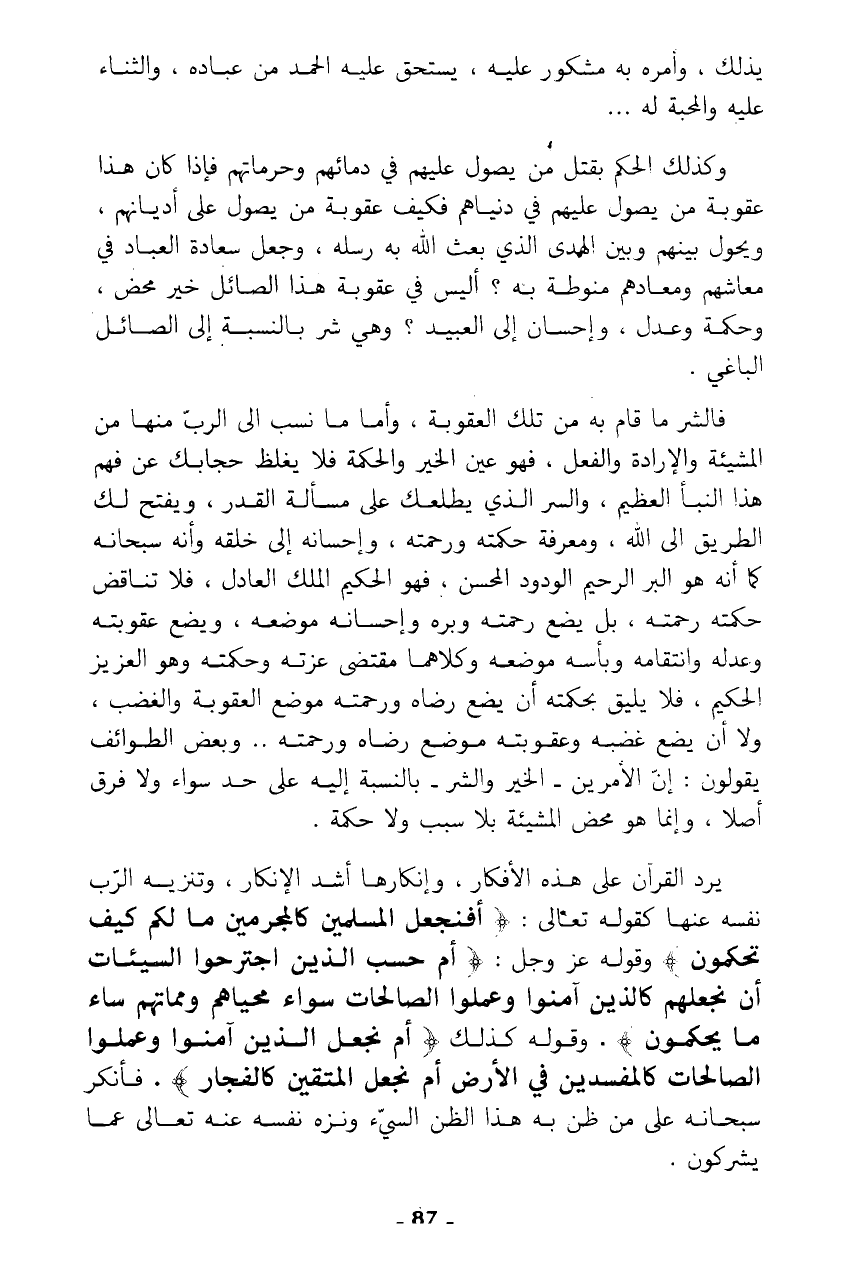 فالشر ما قام به من تلك العقوبة، وأما ما نسب إلى الرب منها من المشيئة والإرادة والفعل، فهو عين الخير والحكمة فلا يغلظ حجابك عن فهم هذا النبأ العظيم، والسر الذي يطلعك على مسألة القدر، ويفتح لك الطريق إلى الله، ومعرفة حكمته ورحمته، وإحسانه إلى خلقه وأنه سبحانه كما أنه هو البر الرحيم الودود المحسن، فهو الحكيم الملك العادل، فلا تناقض حكمته رحمته، بل يضع رحمته وبره وإحسانه موضعه، ويضع عقوبته وعدله وانتقامه وبأسه موضعه وكلاهما مقتضى عزته وحكمته وهو العزيز الحكيم، فلا يليق بحكمته أن يضع رضاه ورحمته موضع العقوبة والغضب، ولا أن يضع غضبه وعقوبته موضع رضاه ورحمته .. وبعض الطوائف يقولون: إن الأمرين- الخير والشر- بالنسبة إليه على حد سواء ولا فرق أصلا، وإنما هو محض المشيئة بلا سبب ولا حكمة.