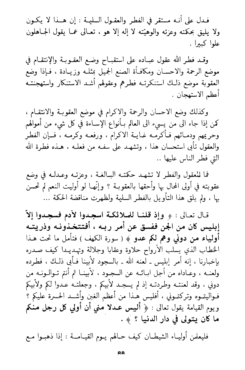 فما للعقول والفطر لا تشهد حكمته البالغة، وعزته وعدله في وضع عقوبته في أولى المحال بها وأحقها بالعقوبة؟ وإنها لو أوليت النعم لم تحسن بها، ولم يلق هذا التأويل بالفطر السليمة ولظهرت مناقضة الحكمة ...
