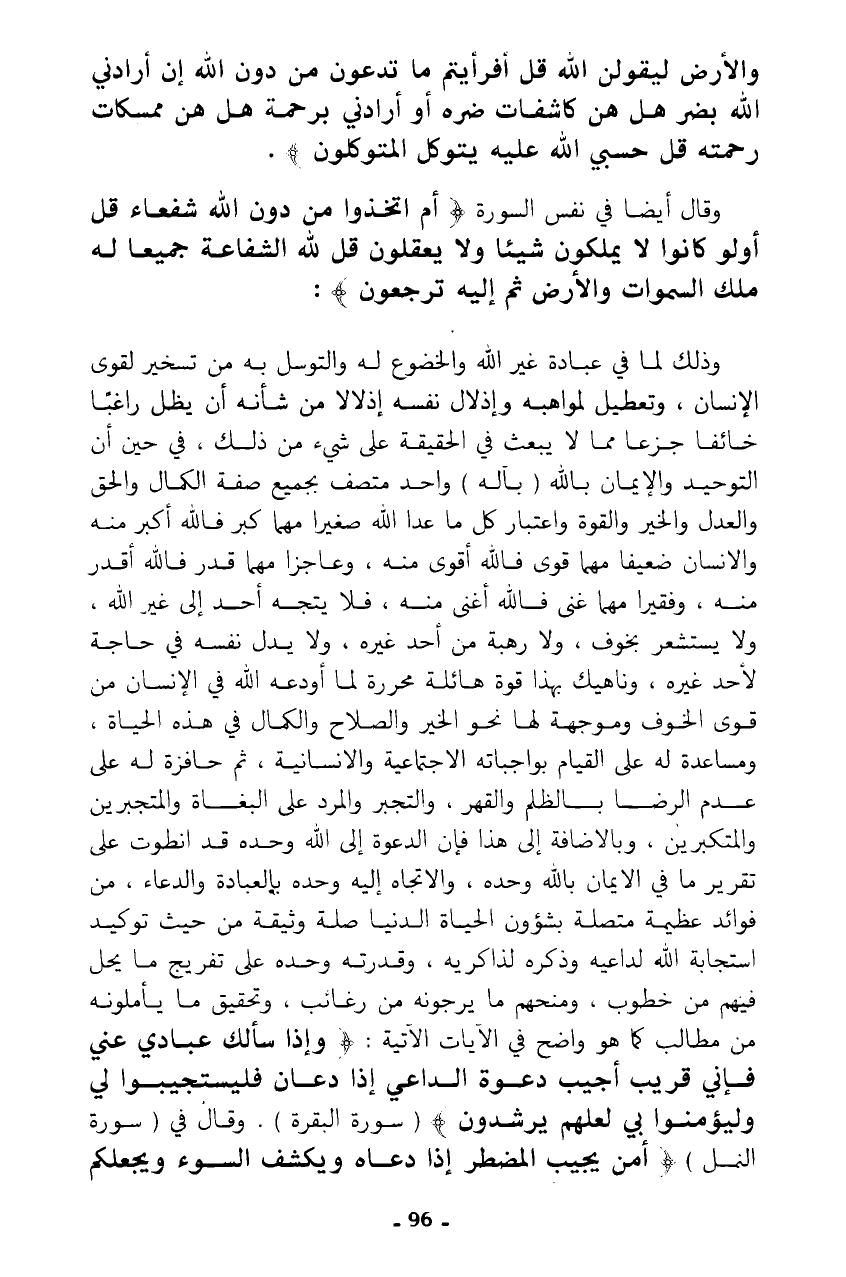 وَالْأَرْضَ لَيَقُولُنَّ اللَّهُ قُلْ أَفَرَأَيْتُمْ مَا تَدْعُونَ مِنْ دُونِ اللَّهِ إِنْ أَرَادَنِيَ اللَّهُ بِضُرٍّ هَلْ هُنَّ كَاشِفَاتُ ضُرِّهِ أَوْ أَرَادَنِي بِرَحْمَةٍ هَلْ هُنَّ مُمْسِكَاتُ رَحْمَتِهِ قُلْ حَسْبِيَ اللَّهُ عَلَيْهِ يَتَوَكَّلُ الْمُتَوَكِّلُونَ}.