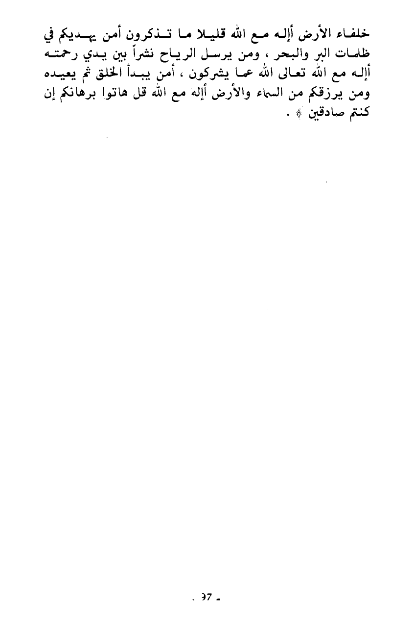 خُلَفَاءَ الْأَرْضِ أَإِلَهٌ مَعَ اللَّهِ قَلِيلًا مَا تَذَكَّرُونَ * أَمَّنْ يَهْدِيكُمْ فِي ظُلُمَاتِ الْبَرِّ وَالْبَحْرِ وَمَنْ يُرْسِلُ الرِّيَاحَ بُشْرًا بَيْنَ يَدَيْ رَحْمَتِهِ أَإِلَهٌ مَعَ اللَّهِ تَعَالَى اللَّهُ عَمَّا يُشْرِكُونَ * أَمَّنْ يَبْدَأُ الْخَلْقَ ثُمَّ يُعِيدُهُ وَمَنْ يَرْزُقُكُمْ مِنَ السَّمَاءِ وَالْأَرْضِ أَإِلَهٌ مَعَ اللَّهِ قُلْ هَاتُوا بُرْهَانَكُمْ إِنْ كُنْتُمْ صَادِقِينَ}.