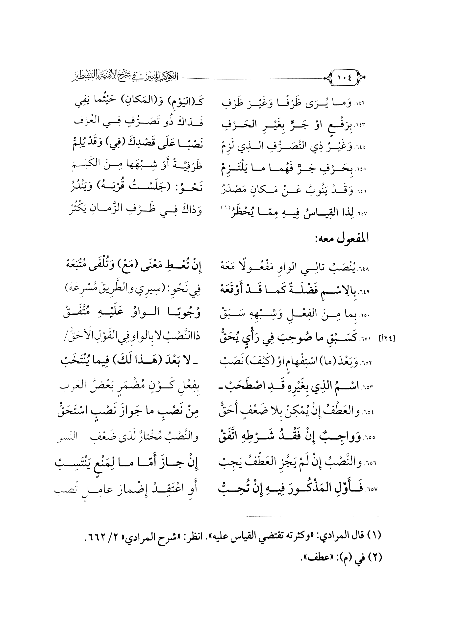 \٢٤ أ\ ... ذَا النَّصْبُ لَا بِالوَاوِ فِي القَوْلِ الأَحَقّْ ... ٦٥١. كَسَبْقِ مَا صُوحِبَ فِي رَأْيٍ يُحَقّْ ...