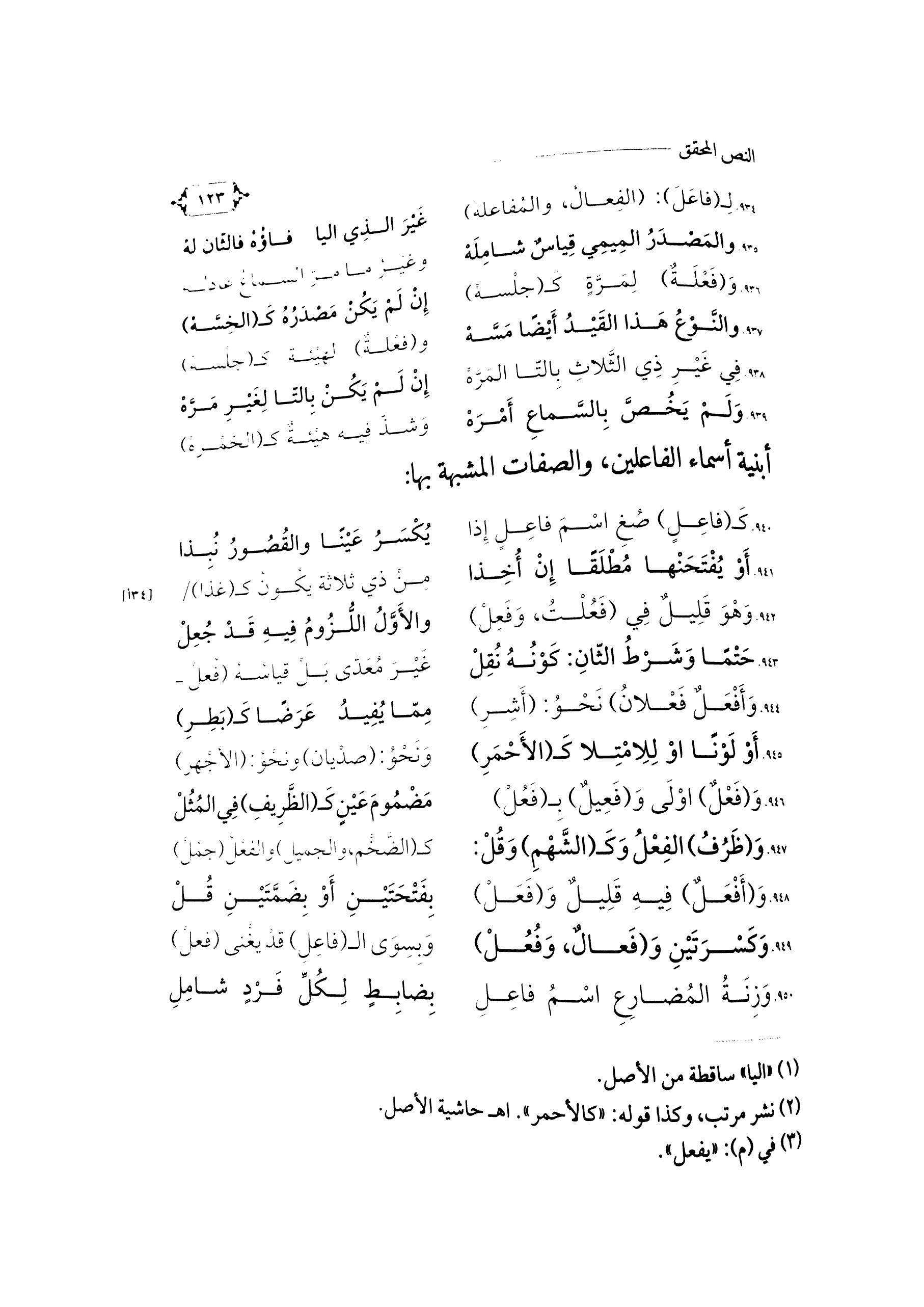 ٩٣٤. لِـ (فَاعَلَ): (الفِعَالُ، وَالمُفَاعَلَهْ) ... غَيْرَ الذِي اليَا (¬١) فَاؤُهُ فَالثَّانِ لَهْ ...