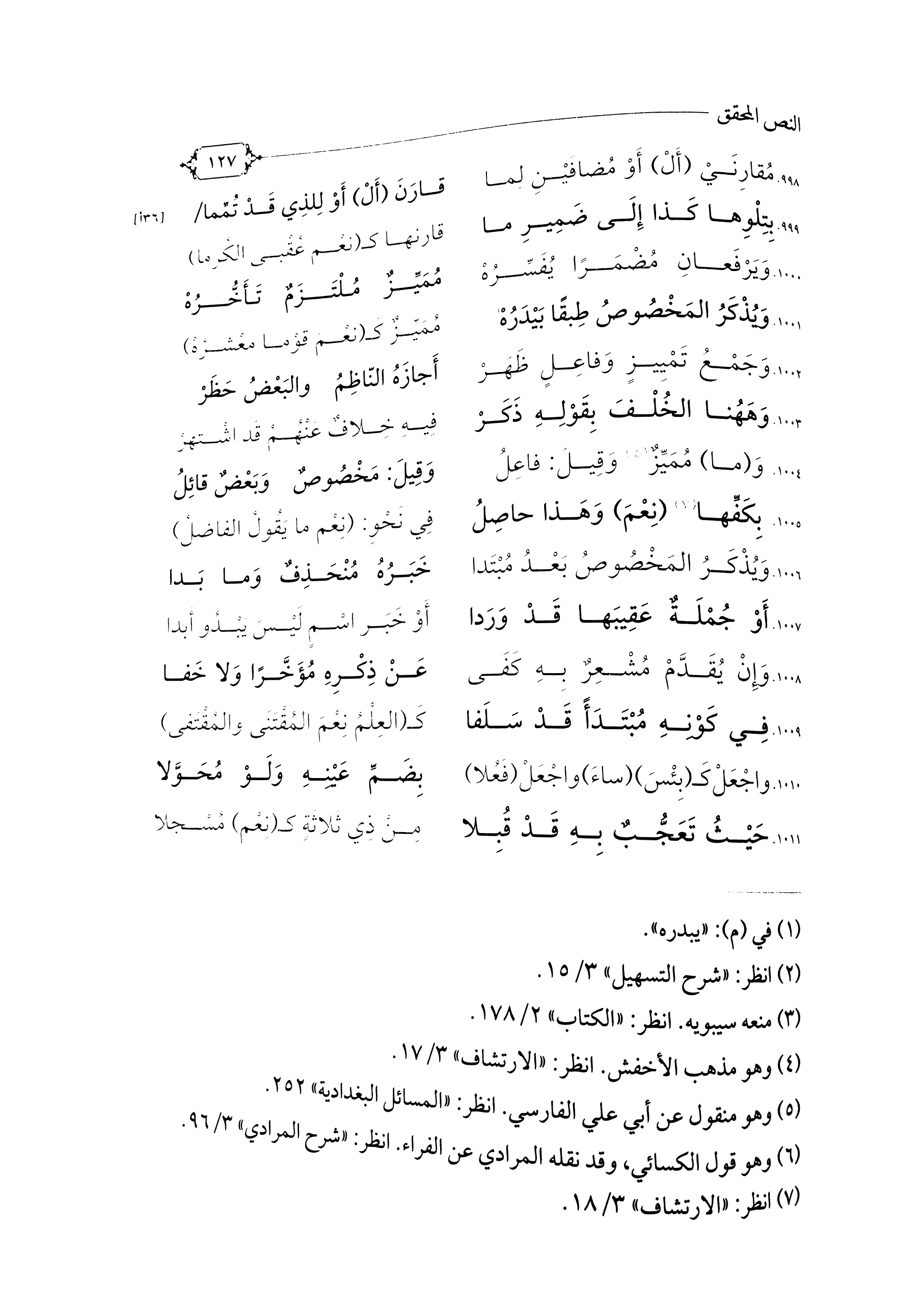 \٣٦ أ\ ... قَارَنَ (أَلْ) أَوْ لِلذِي قَدْ تُمِّمَا ... ٩٩٨. مُقَارِنَيْ (أَلْ) أَوْ مُضَافَيْنِ لِمَا ...