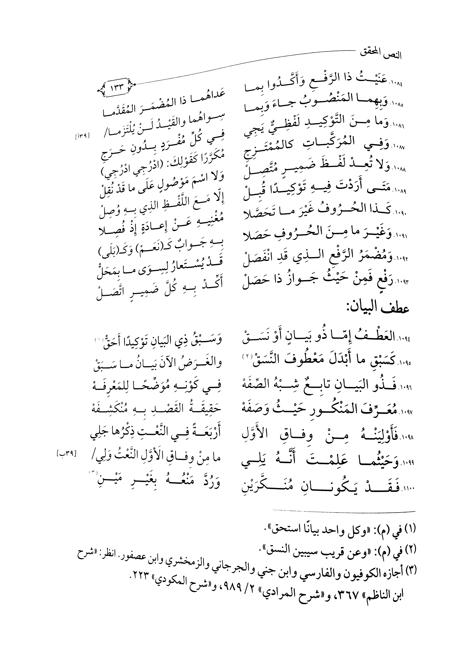 ١٠٩٤. العَطْفُ إِمَّا ذُو بَيَانٍ أَوْ نَسَقْ ... وَسَبْقُ ذِي البَيَانِ تَوْكِيدًا أَحَقّْ (¬١) ...