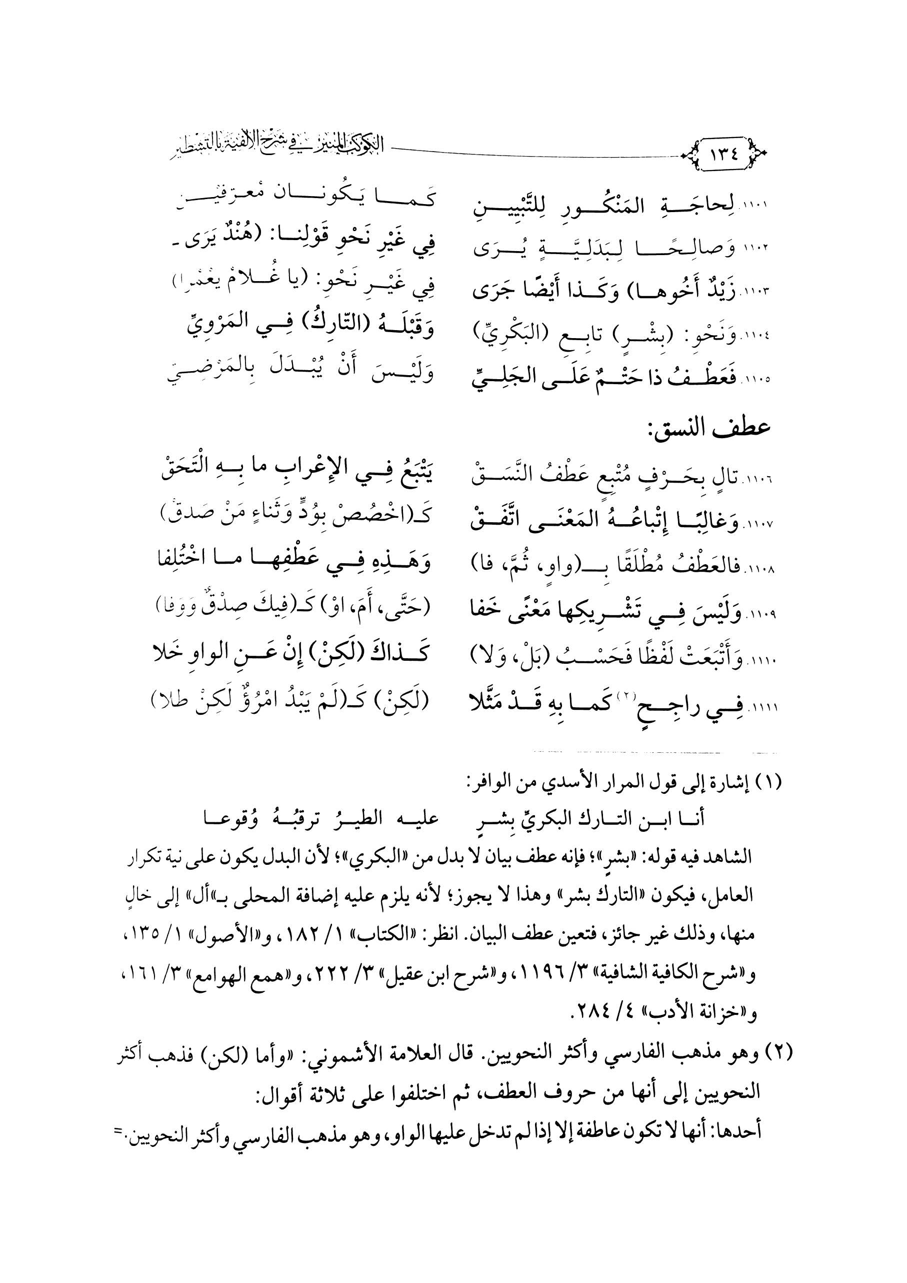 ١١٠٦. تَالٍ بِحَرْفٍ مُتْبِعٍ عَطْفُ النَّسَقْ ... يَتْبَعُ فِي الإِعْرَابِ مَا بِهِ الْتَحَقْ ...