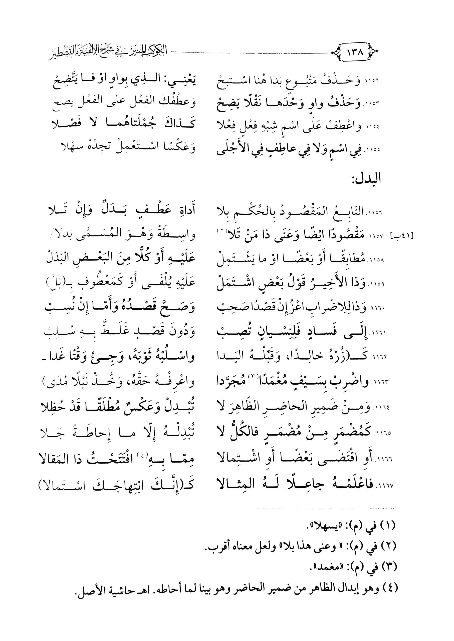 \٤١ ب\ ... وَاسِطَةٍ وَهْوَ المُسَمَّى بَدَلَا ... ١١٥٧. مَقْصُودًا ايْضًا وَعَنَى ذَا مَنْ تَلَا (¬٢) ...