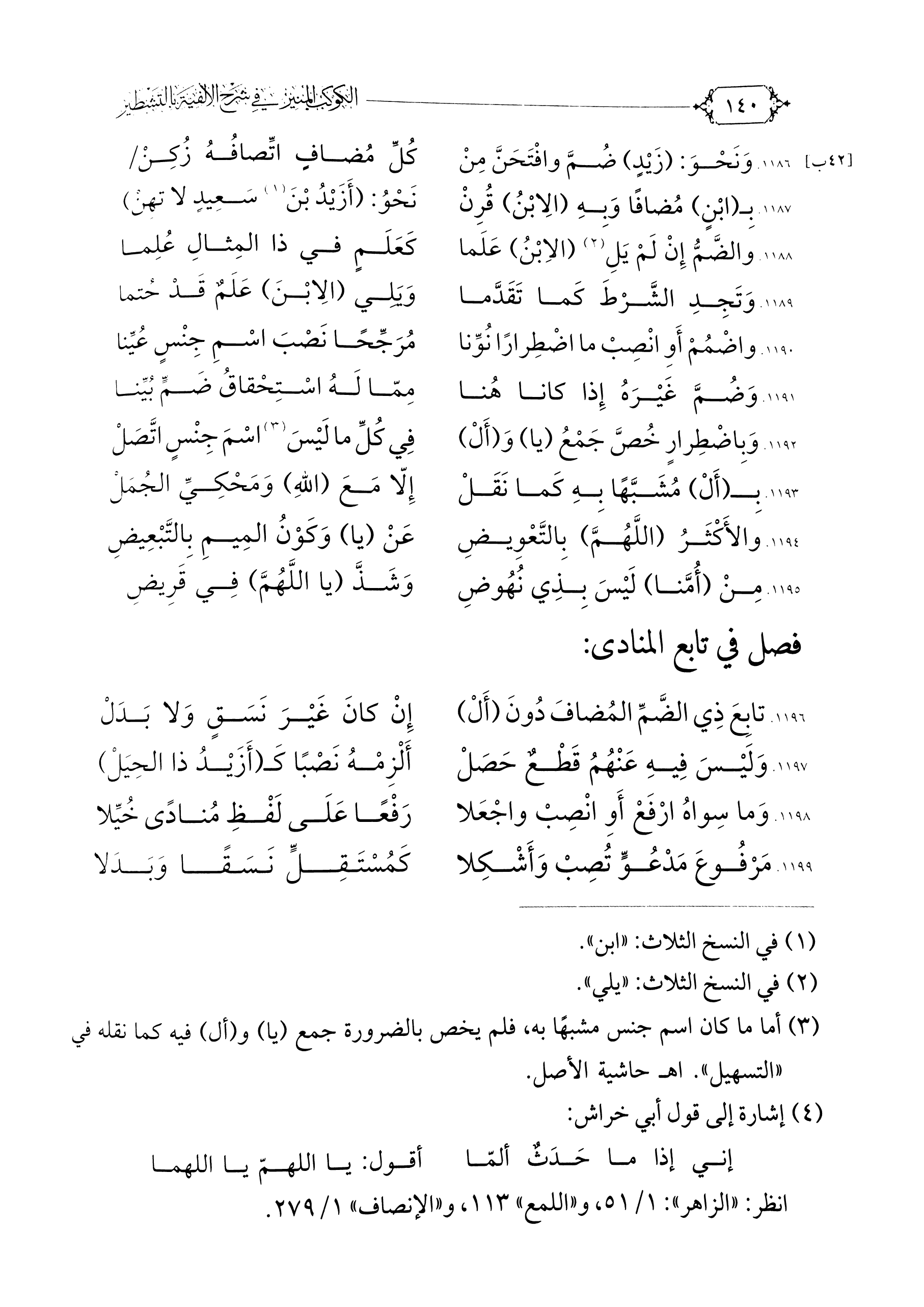 \٤٢ ب\ ... كُلِّ مُضَافٍ اتِّصَافُهُ زُكِنْ ... ١١٨٦. وَنَحْوَ (زَيْدٍ) ضُمَّ وَافْتَحَنَّ مِنْ ...