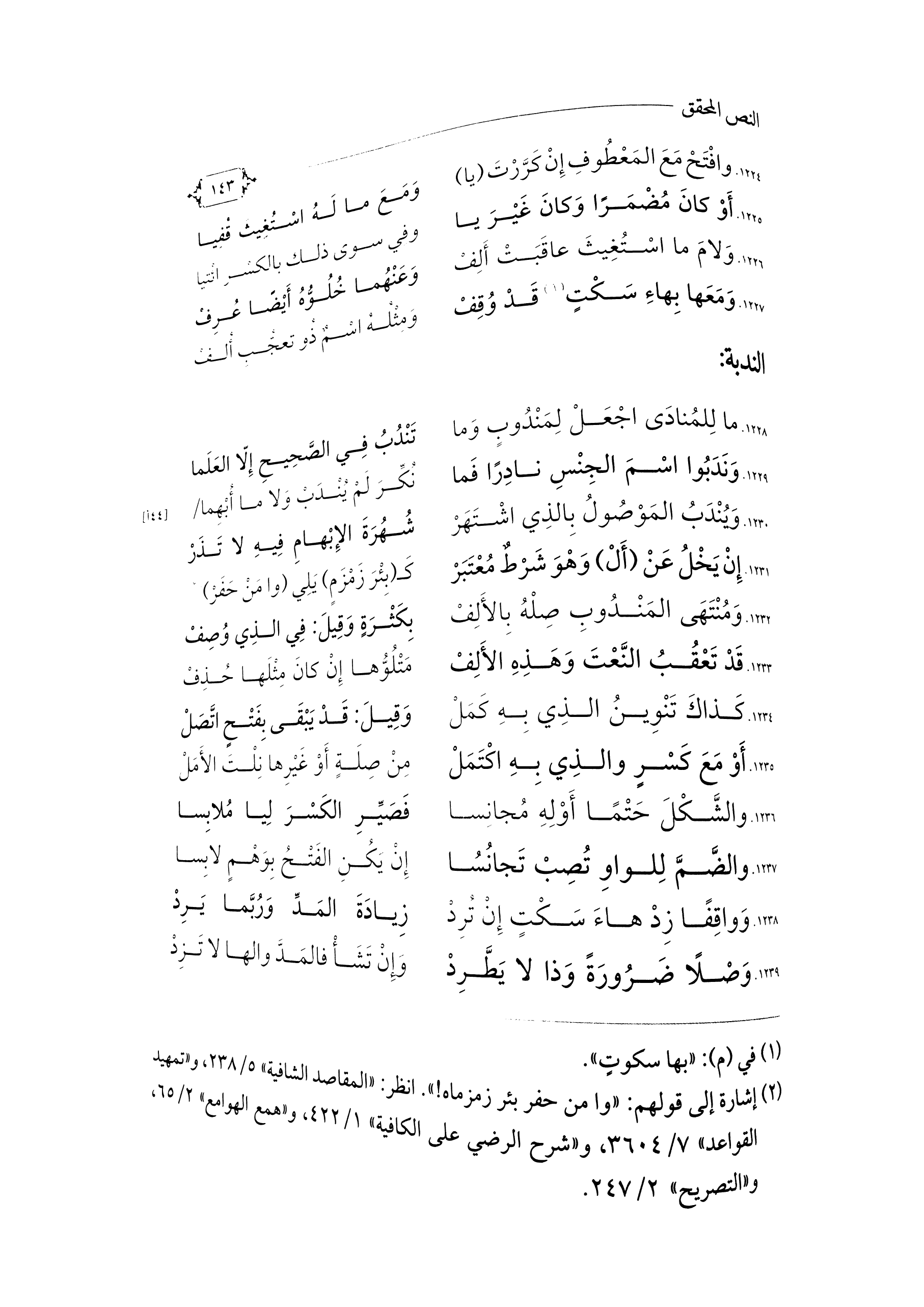 \٤٤ أ\ ... نُكِّرَ لَمْ يُنْدَبْ وَلَا مَا أُبْهِمَا ... ١٢٢٩. وَنَدَبُوا اسْمَ الجِنْسِ نَادِرًا فَمَا ...