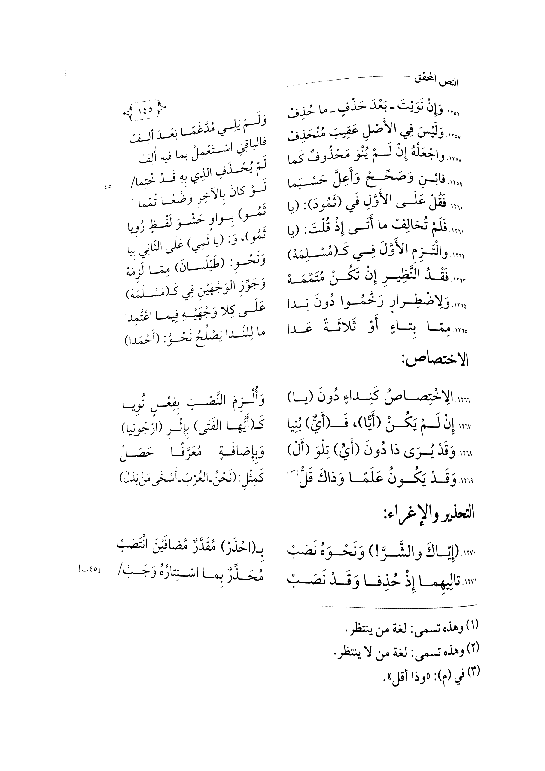 \٤٥ ب\ ... مُحَذِّرٌ بِمَا اسْتِتَارُهُ وَجَبْ ... ١٢٧١. تَالِيهِمَا إِذْ حُذِفَا وَقَدْ نَصَبْ ...