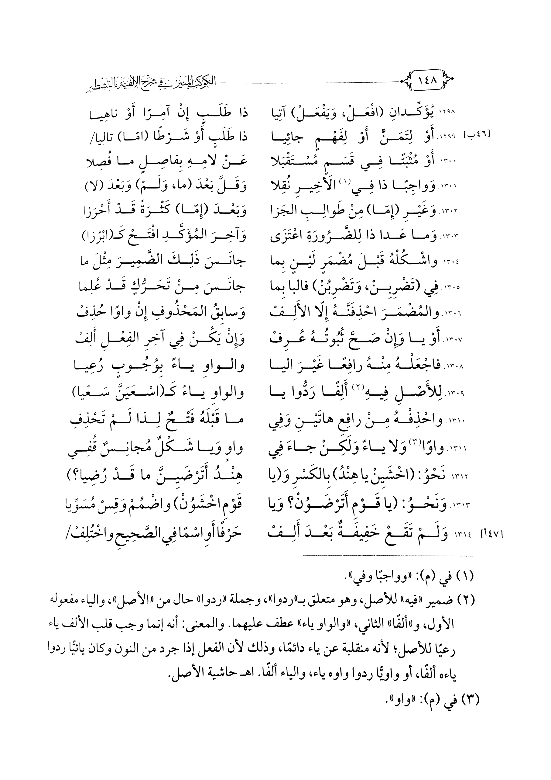 \٤٦ ب\ ... ذَا طَلَبٍ أَوْ شَرْطًا (امَّا) تَالِيَا ... ١٢٩٩. أَوْ لِتَمَنٍّ أَوْ لِفَهْمٍ جَائِيَا ...