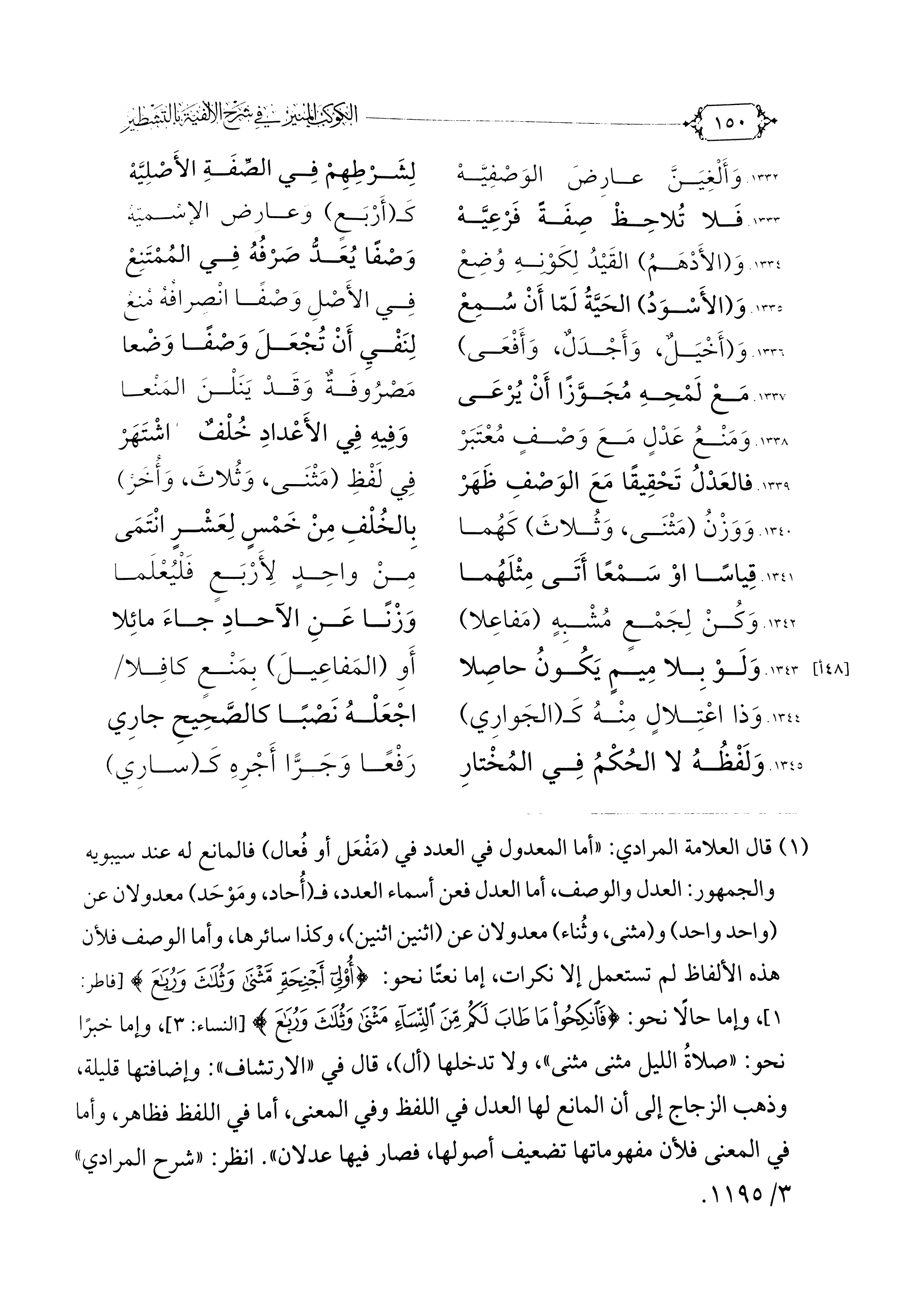 ١٣٣٩. فَالعَدْلُ تَحْقِيقًا مَعَ الوَصْفِ ظَهَرْ ... فِي لَفْظِ (مَثْنَى، وَثُلَاثَ، وَأُخَرْ) ...