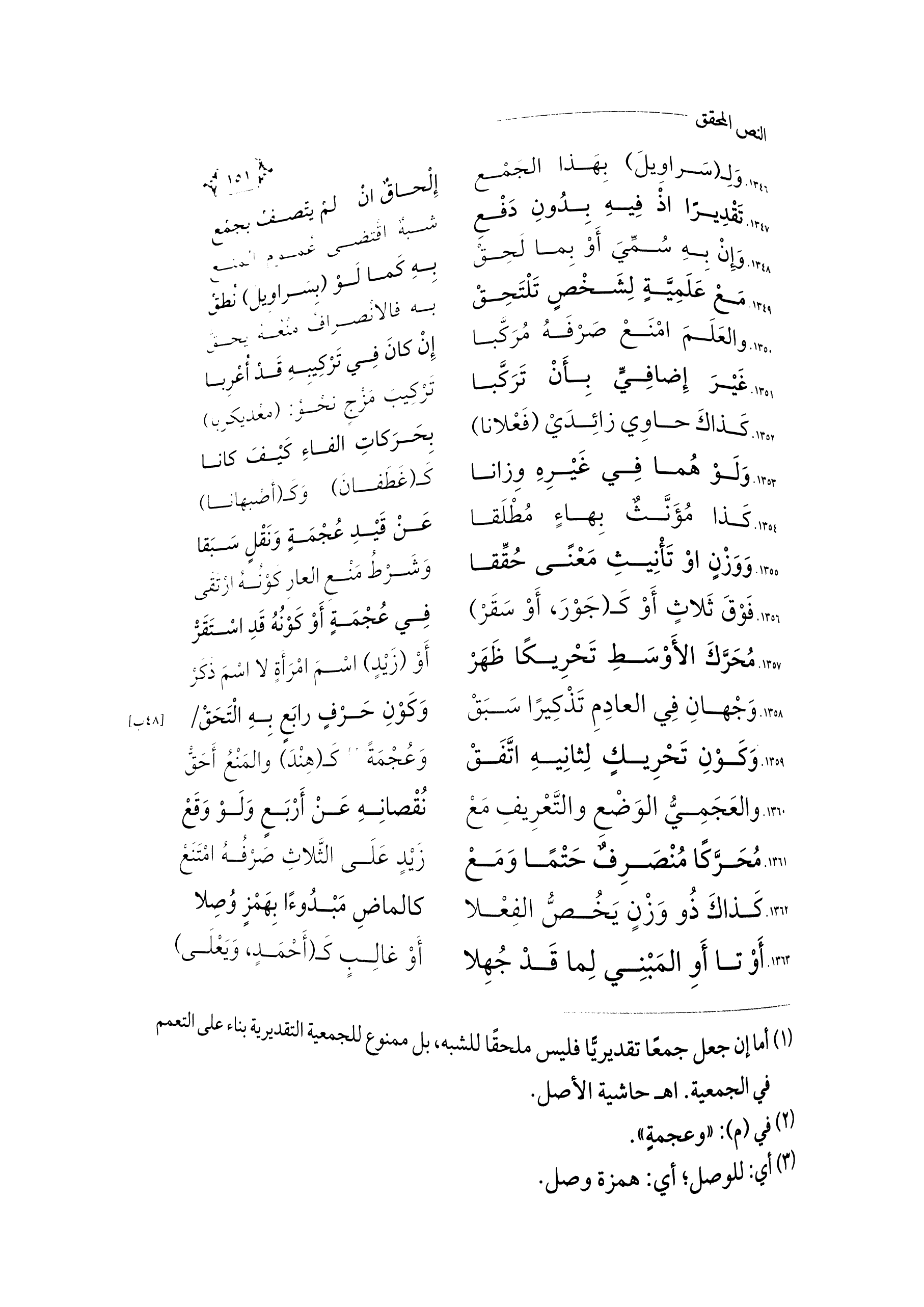 \٤٨ ب\ ... وَكَوْنِ حَرْفٍ رَابَعٍ بِهِ الْتَحَقْ ... ١٣٥٨. وَجْهَانِ فِي العَادِمِ تَذْكِيرًا سَبَقْ ...