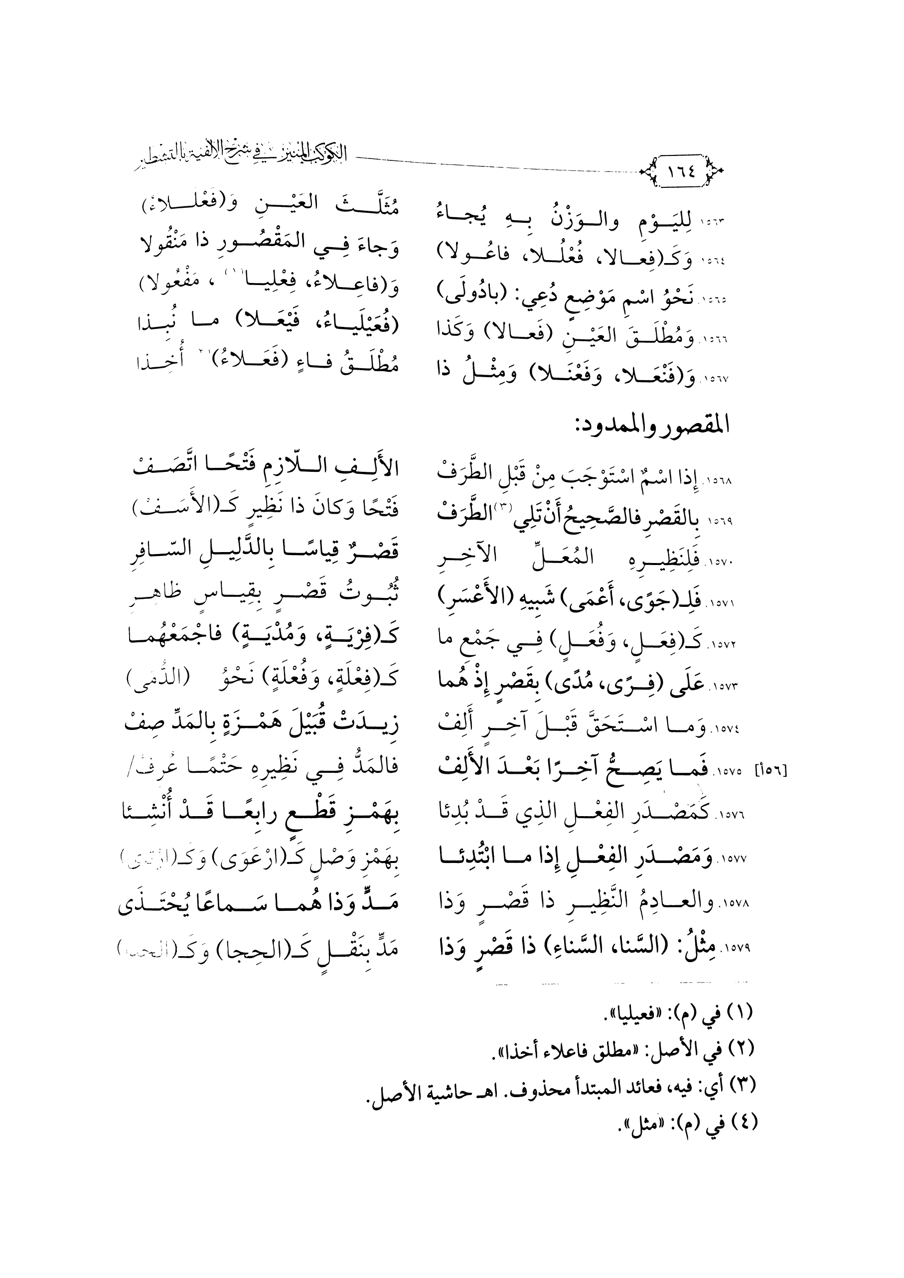 \٥٦ أ\ ... فَالمَدُّ فِي نَظِيرِهِ حَتْمًا عُرِفْ ... ١٥٧٥. فَمَا يَصِحُّ آخِرًا بَعْدَ الأَلِفْ ...